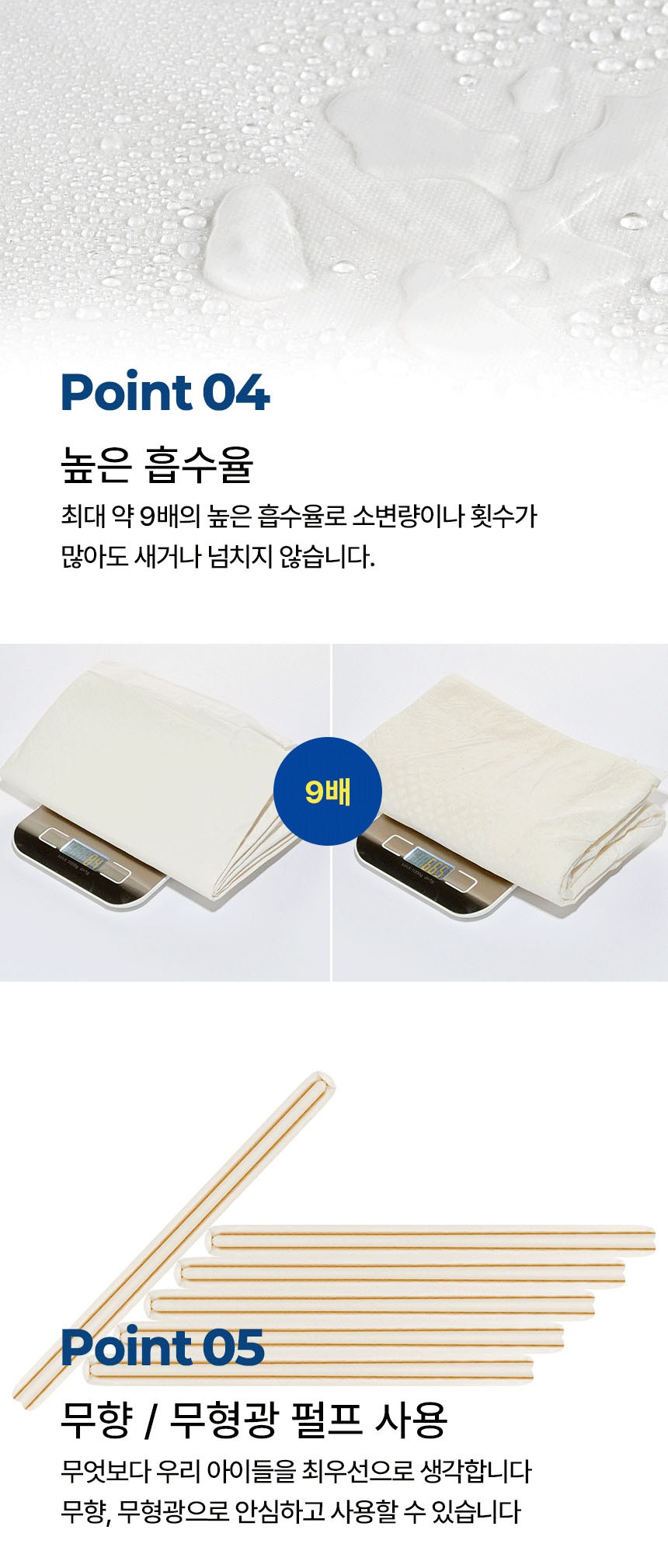 - 흡수력: 고흡수성수지 (SAP) 포함