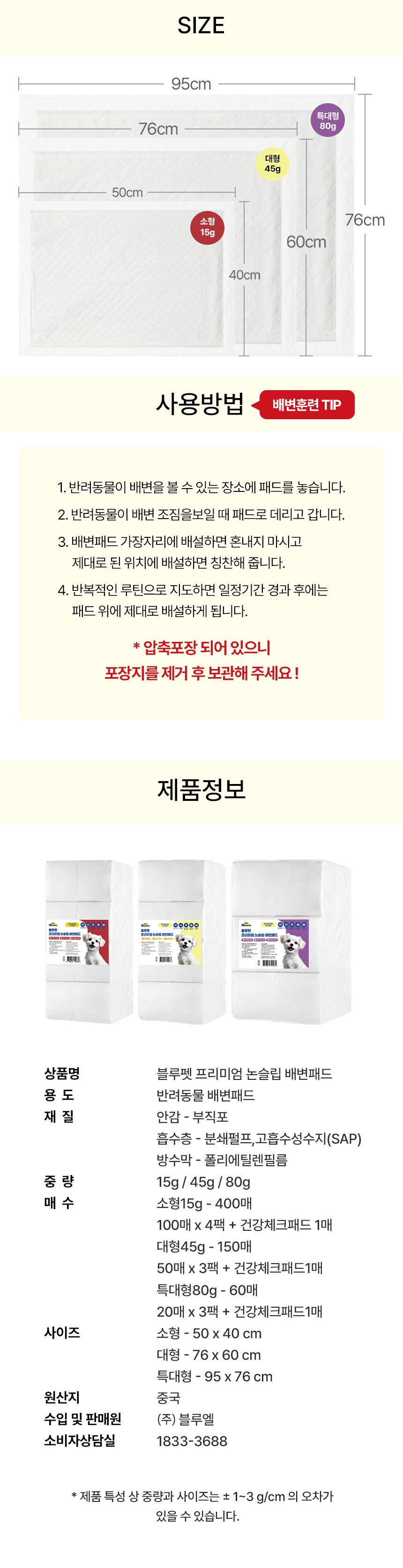 | 품명 및 모델명 | 블루펫 프리미엄 논슬립 배변패 | 인증/허가 사항 | 해당없음 |