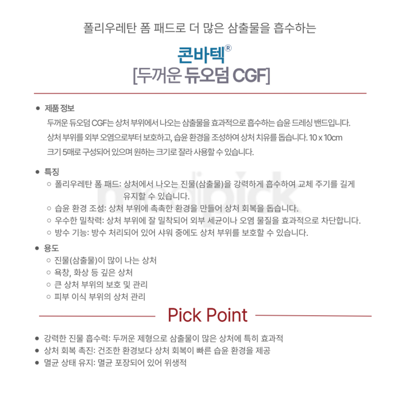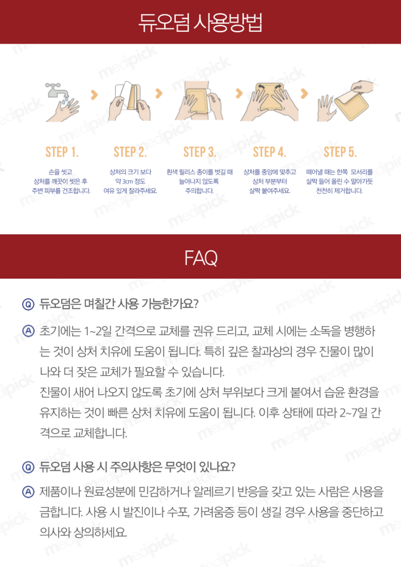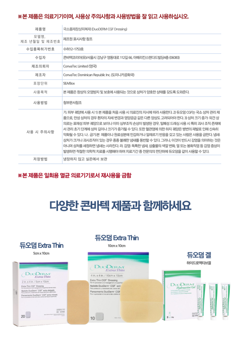 | 품명 및 모델명 | 국소품제창상피복재 (DuoDERM CGF Dressing) | 허가∙인증∙신고번호 (의료기기법에 따른 허가∙인증∙신고 대상 의료기기에 한함) | 수인12-1753 |