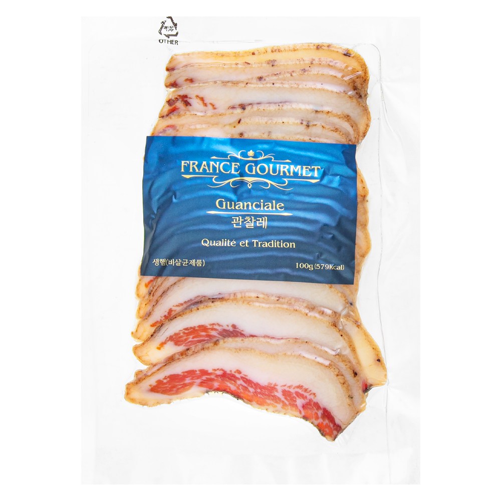 관찰레는 짭짤한 맛이 진한 요리용 베이컨이에요. 그대로 드시기보단, 까르보나라나 아마트리치아나에 넣어 드시는 것을 추천드려요. 특히 까르보나라에 넣으면 깊은 맛과 진한 향을 완성해준답니다.