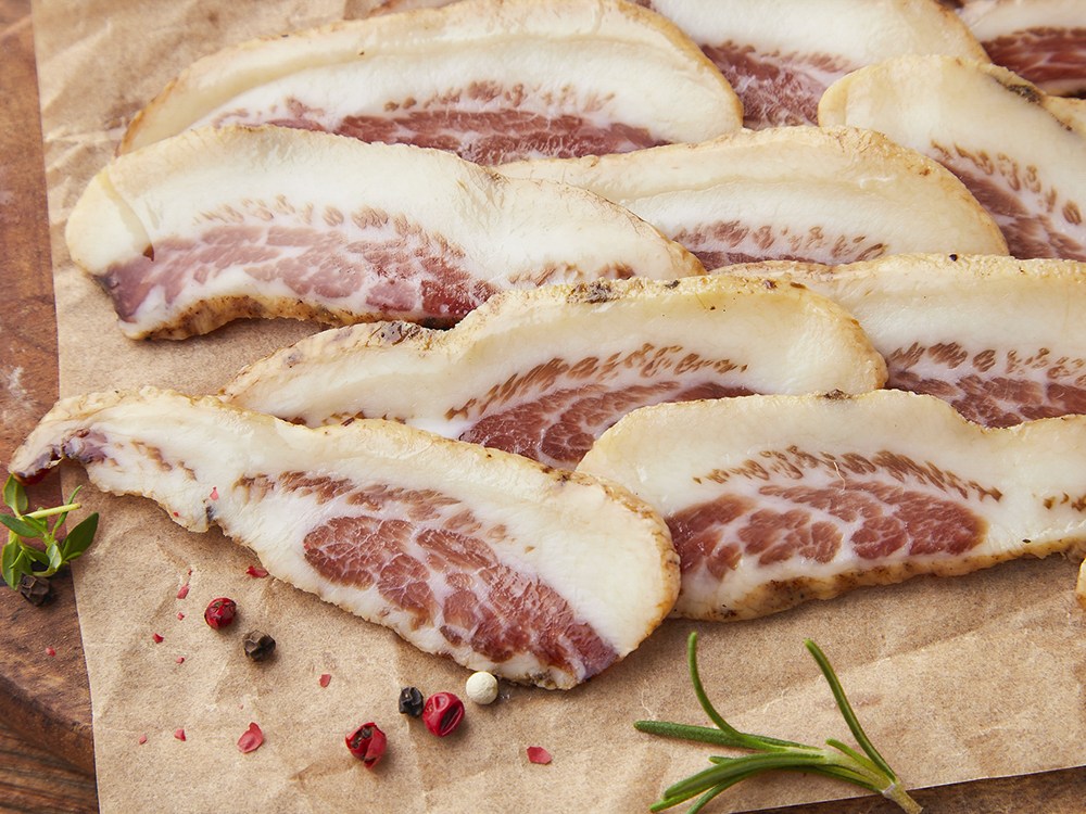 관찰레는 이탈리아식 샤퀴테리로, 돼지고기에 향신료를 더해 숙성하는 요리용 베이컨인데요. 미항정을 사용해 지방의 풍부한 향미가 돋보이는 관찰레를 만나보세요. 건조 로즈마리, 타임 등을 사용해 향긋함이 깊게 배어있답니다. 까르보나라에 넣으면, 특유의 짭짤한 맛으로 파스타의 완성도를 높여줘요.