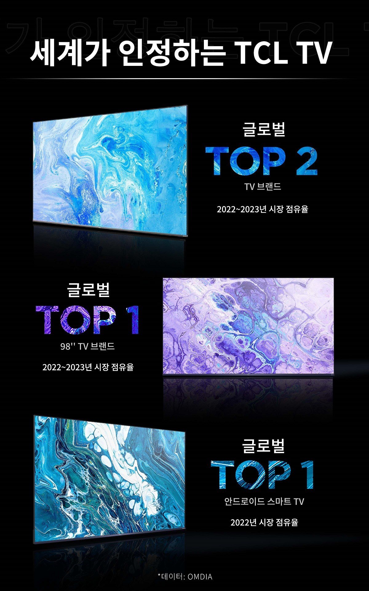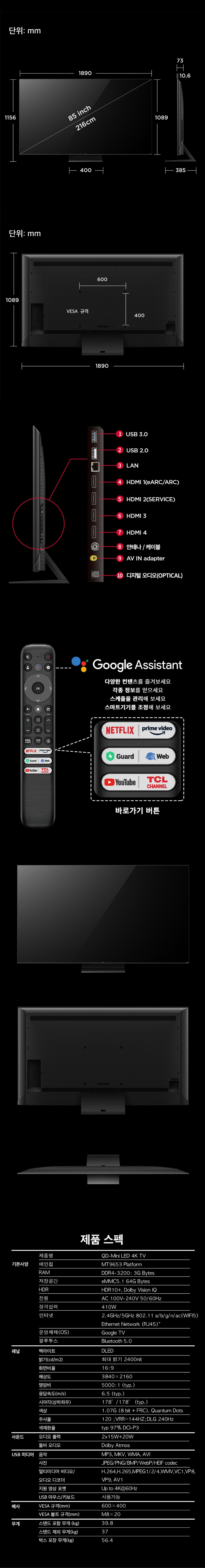 | 품명 및 모델명 | TCL 4K UHD QD Mini LED 스마트TV, 85C765, 방문설치, 벽걸이형, 216cm(85인치)/ 85C765(모델명) | KC 인증정보 | 본품: XU090397-24096, R-R-TcL-85C765ㅣ무선모듈: R-C-Gsd-WKCT2HM2501 |