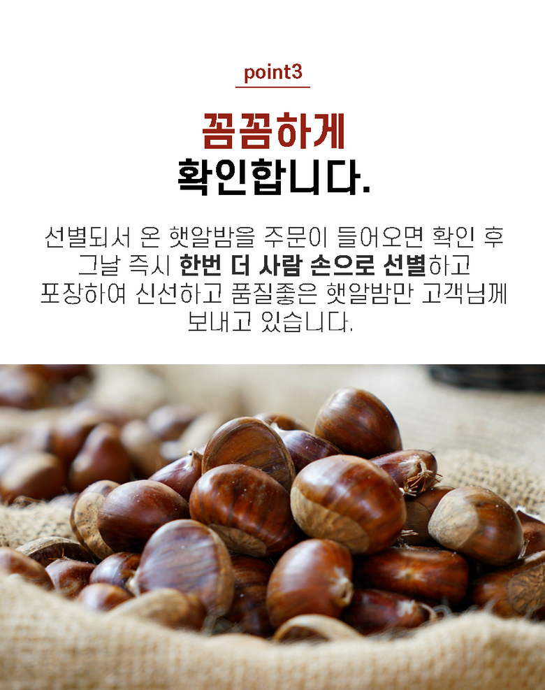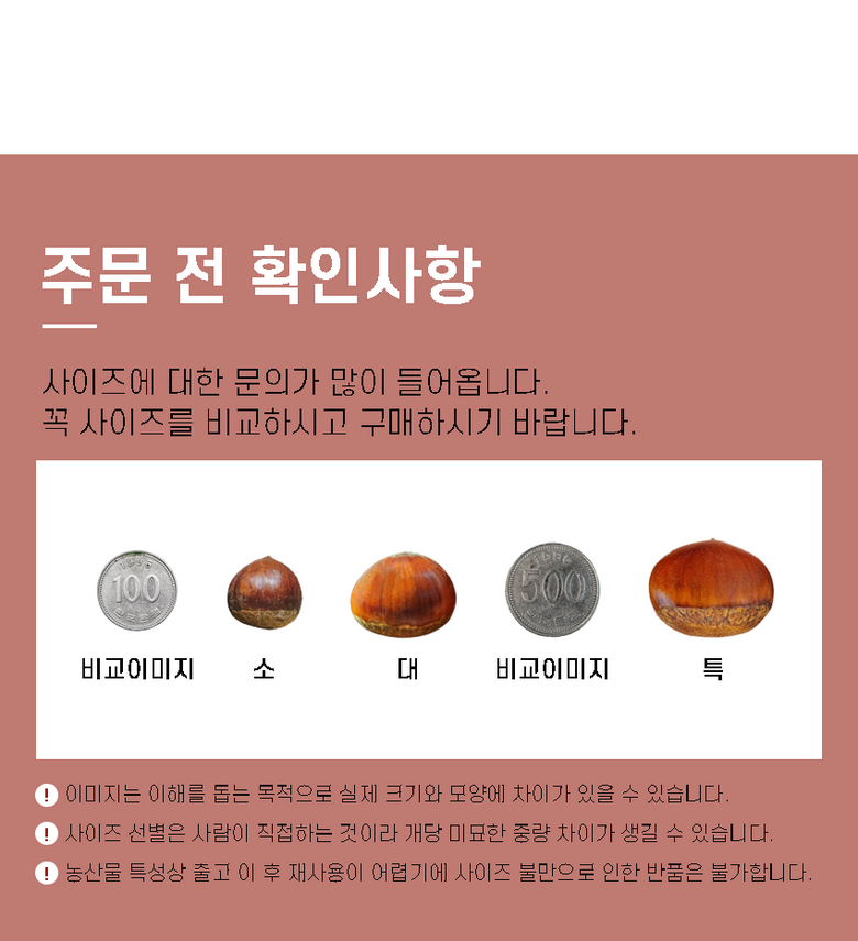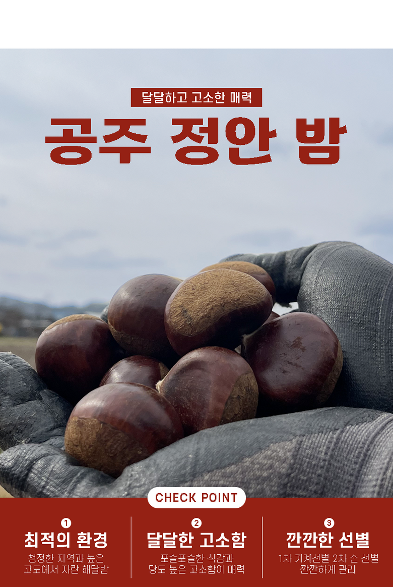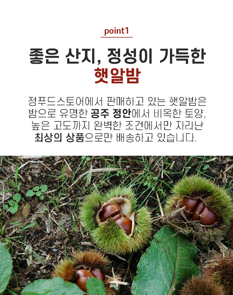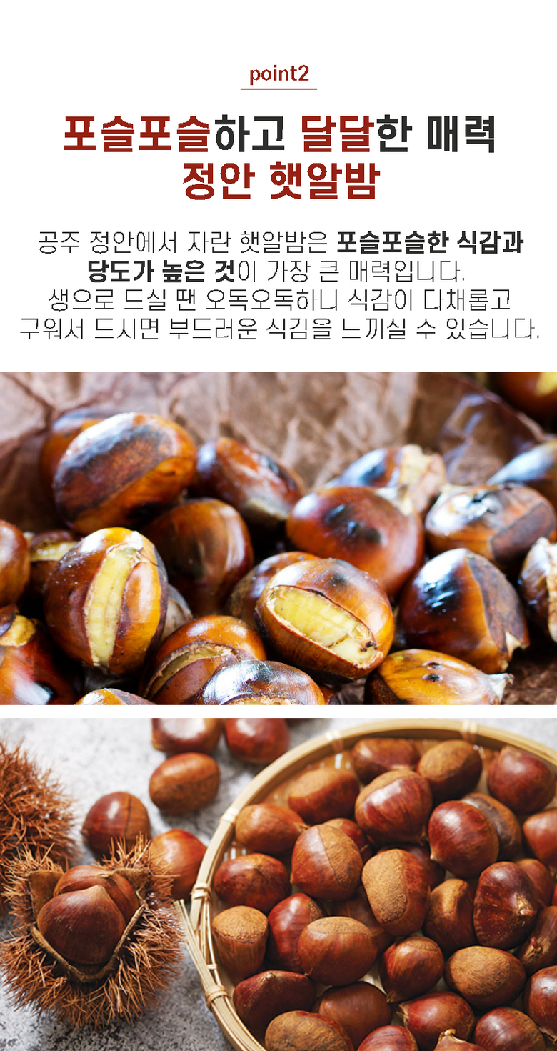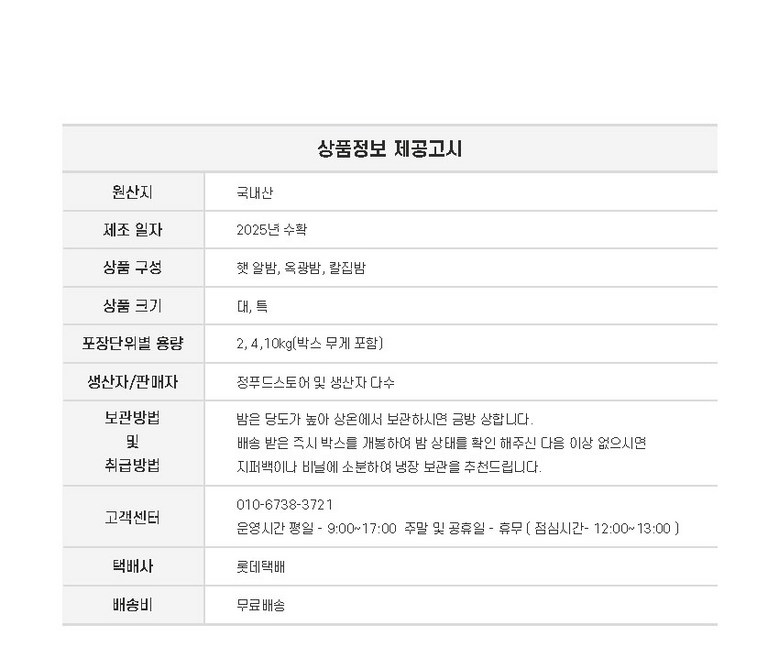 | 품목 또는 명칭 | 2025 공주 햇 알밤 | 포장단위별 내용물의 용량(중량),수량,크기 | 2kg,4kg,10kg으로 구성 |