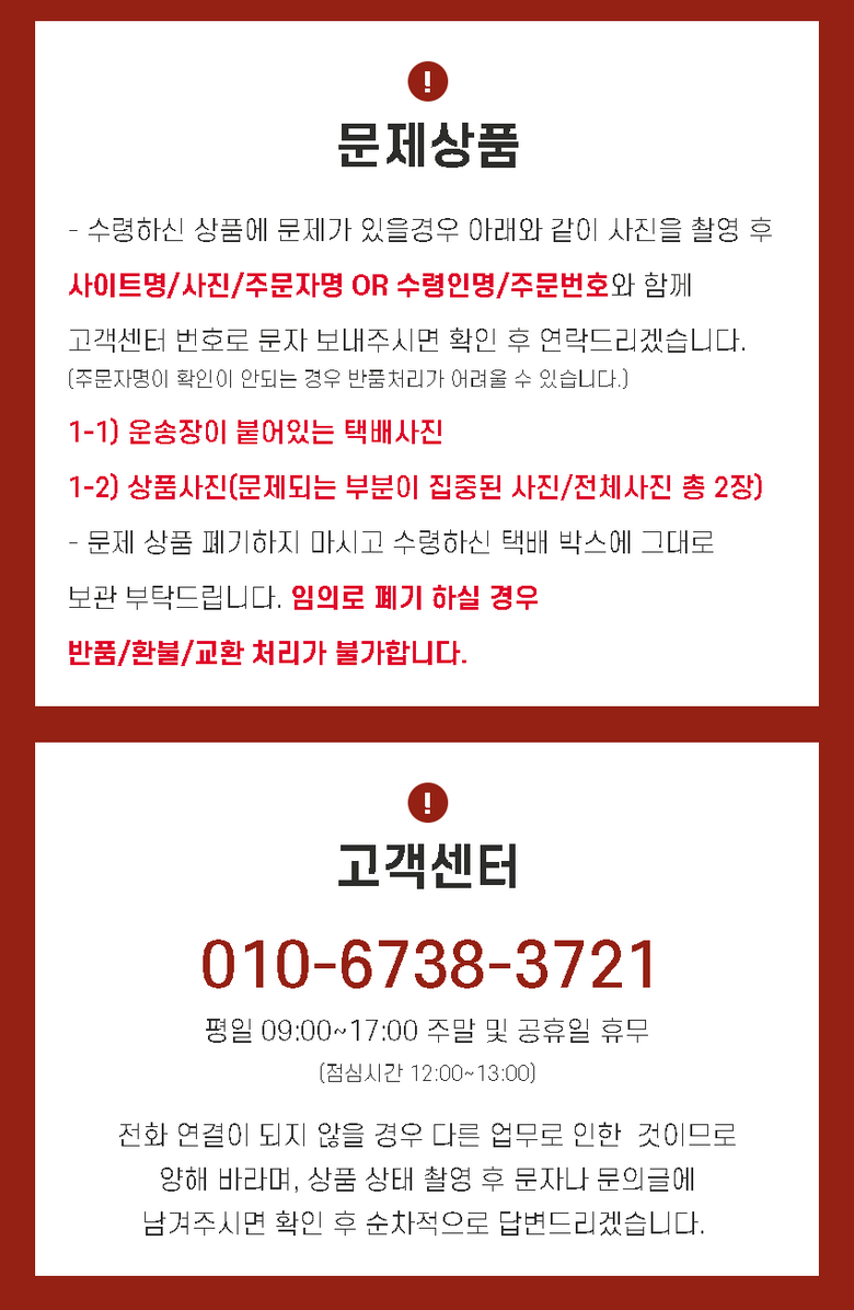 - ㆍ모니터 해상도의 차이로 인해 색상이나 이미지가 실제와 달라, 고객이 단순 변심으로 교환/반품을 무료로 요청하는 경우