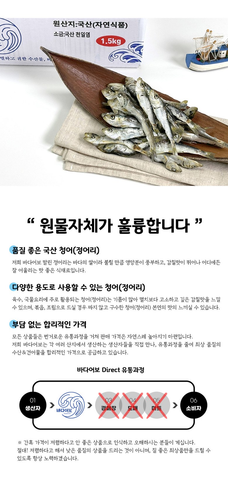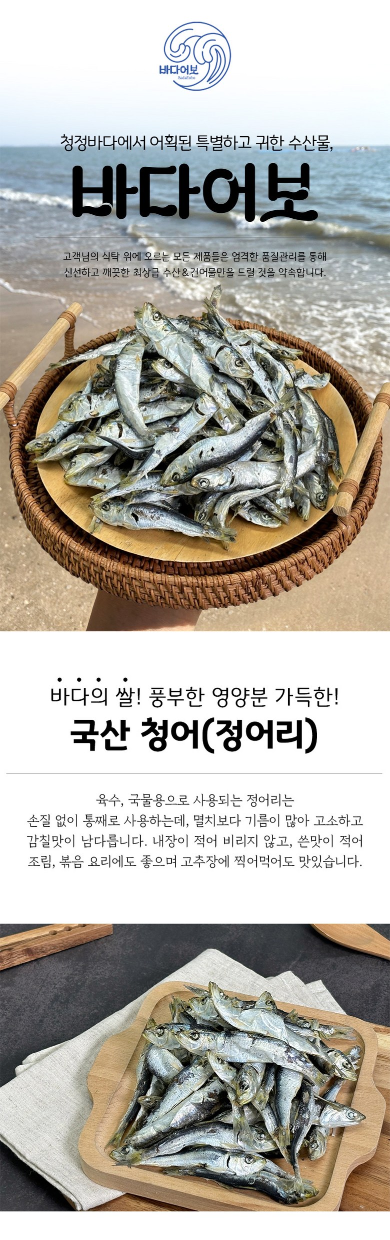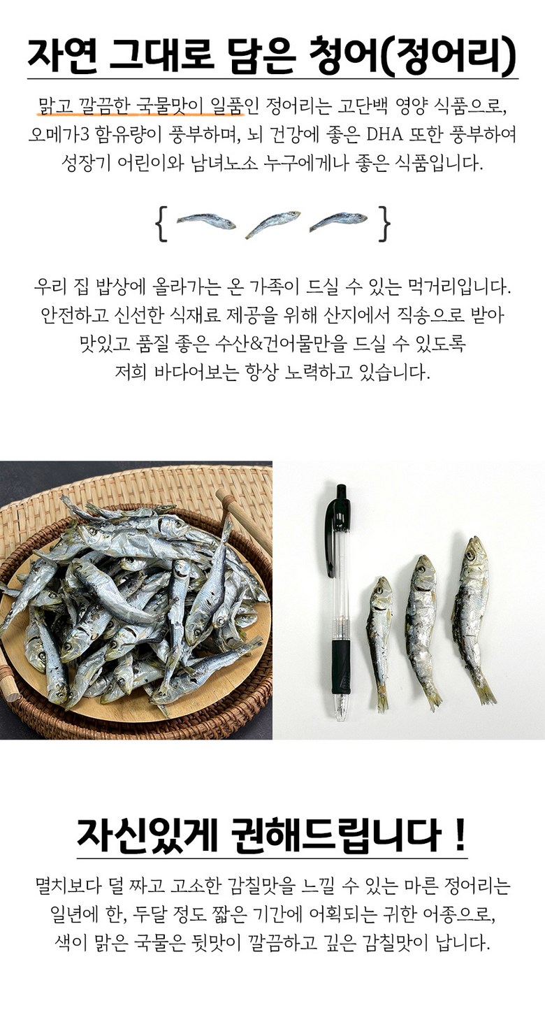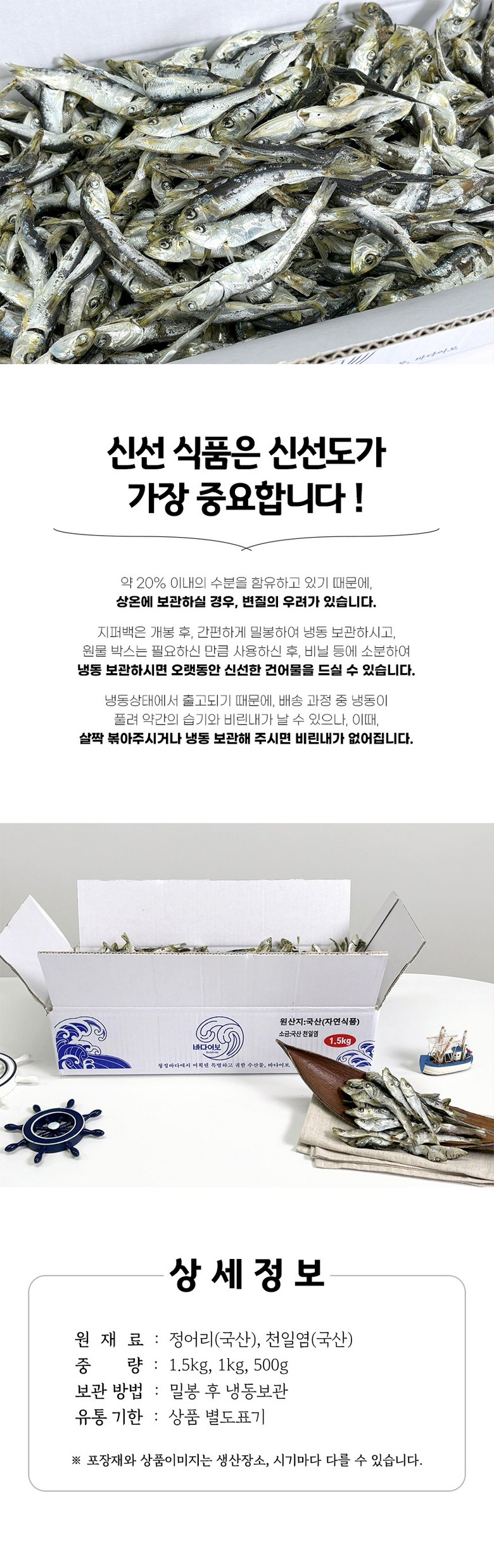 | 품목 또는 명칭 | 남해안 햇 국물용 솔치 청어(정어리) 멸치 상급 (육수용) | 포장단위별 내용물의 용량(중량),수량,크기 | 1.5kg, 1kg, 500g |