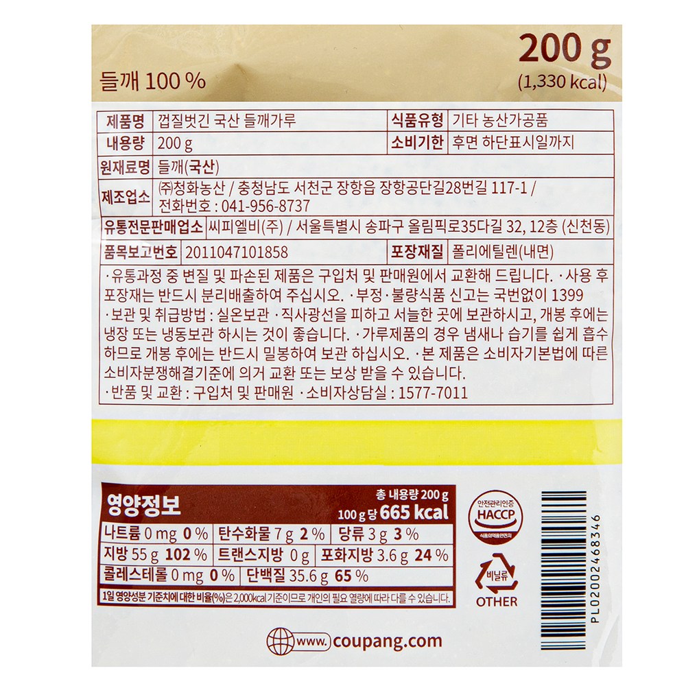 | 제품명 | 곰곰 껍질벗긴 국산 들깨 가루, 200g | 식품의 유형 | 기타농산가공품 |