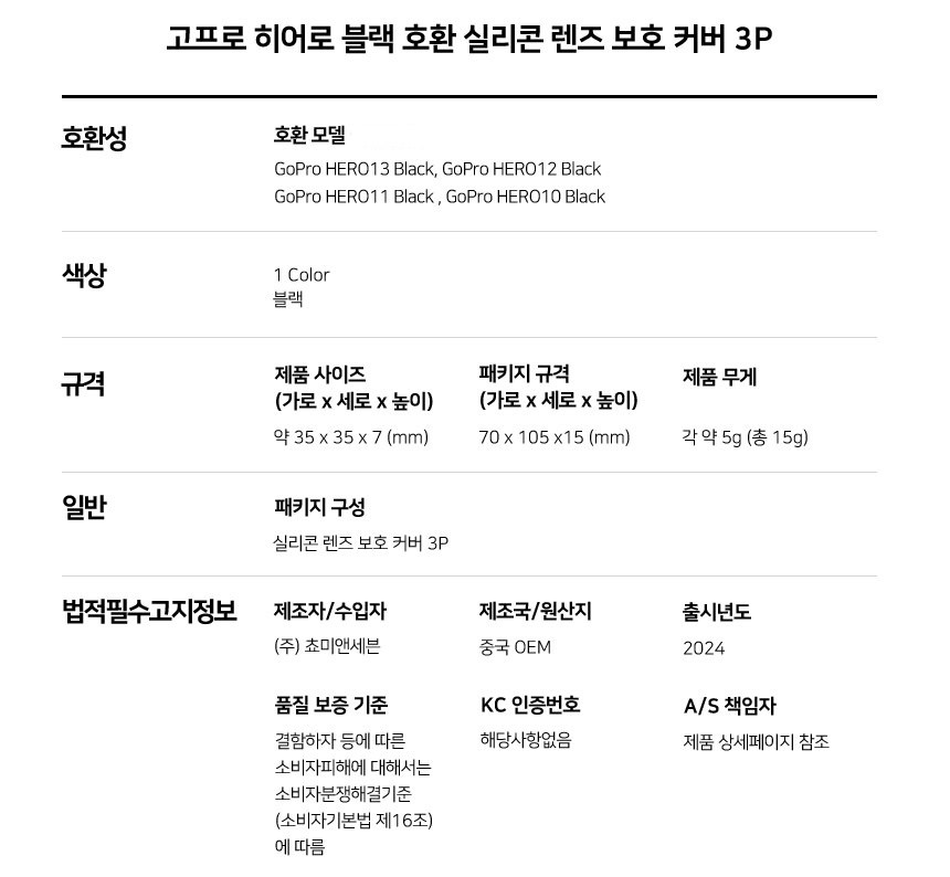 | 품명 및 모델명 | 스페이스쉴드 고프로 히어로 블랙 호환 실리콘 렌즈 보호 커버 | 인증/허가 사항 | 해당없음 |
