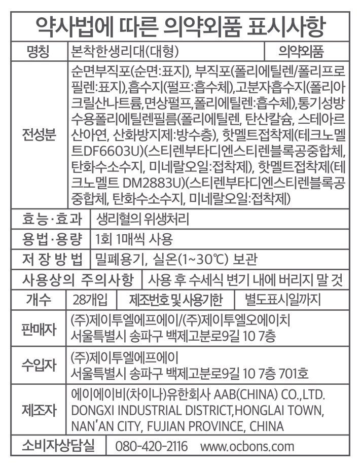 | 품명 및 모델명 | 본착한생리대(대형) | 인증/허가 사항 | 의약외품 |