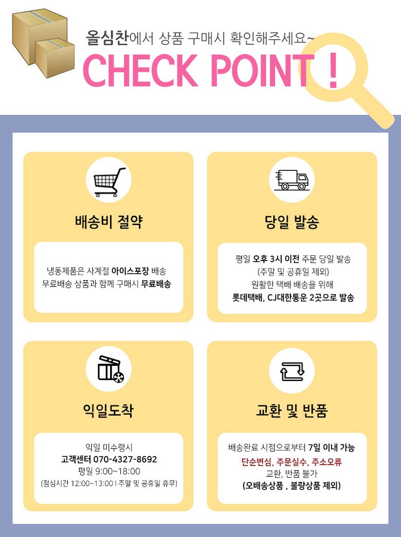 - ㆍ모니터 해상도의 차이로 인해 색상이나 이미지가 실제와 달라, 고객이 단순 변심으로 교환/반품을 무료로 요청하는 경우