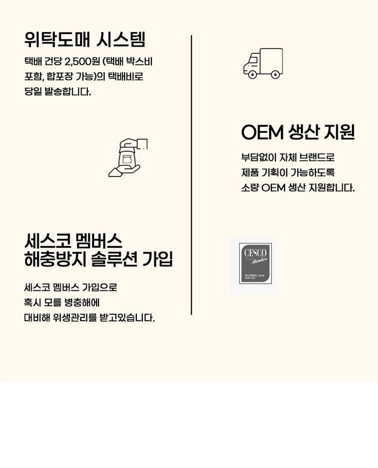 | 배송방법 | 순차배송 | 배송비 | 무료배송 · 도서산간 추가 배송비 - 제주 지역: 6,000원 - 도서산간 지역: 6,000원 |