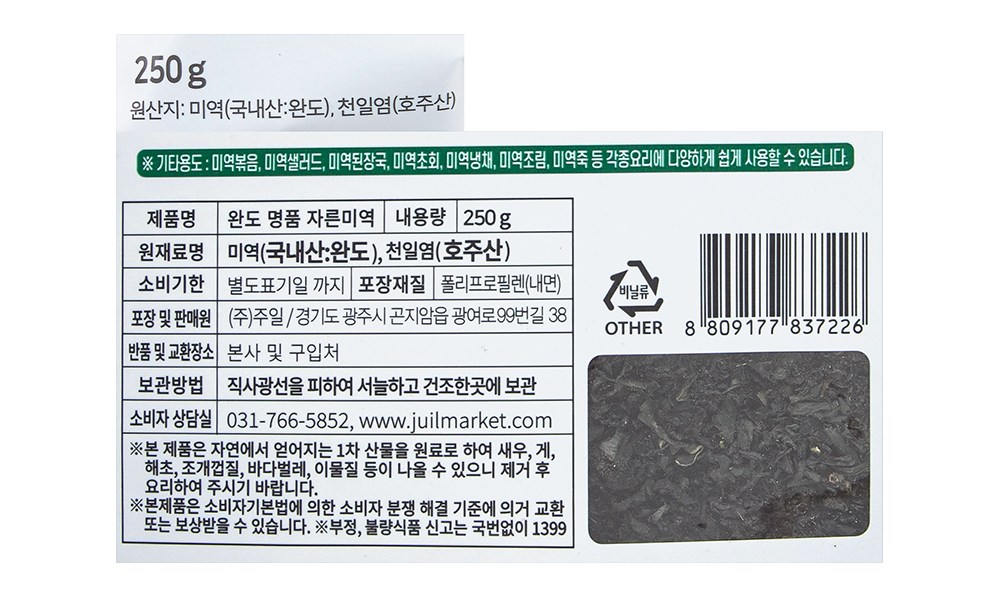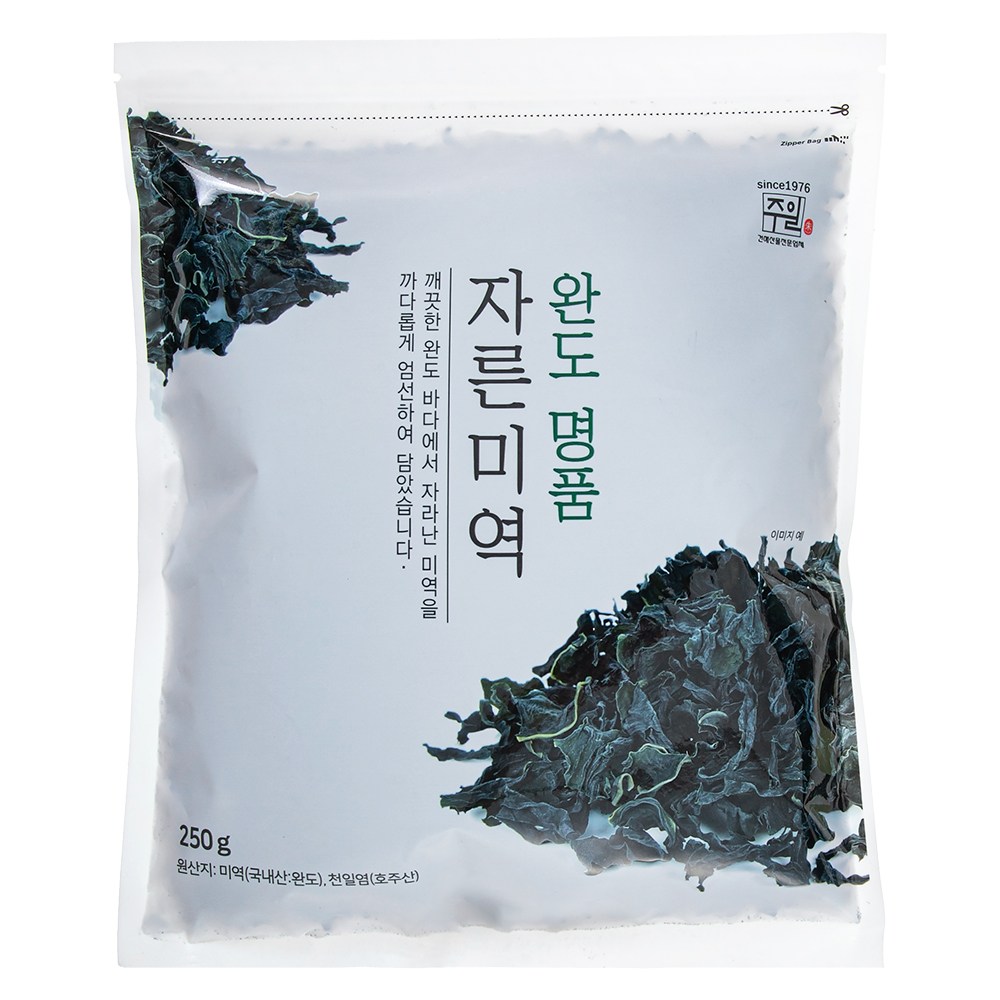 간편하게 요리할 수 있는 자른 미역이에요. 물에 불리고 나면, 특유의 부드럽고 촉촉한 식감이 살아나는데요. 천일염으로 간이 되어 있으니 다채롭게 요리해보세요. 간단히 미역국을 끓여내도 좋고, 샐러드나 초회로 상큼하게 즐겨도 좋아요. 은은하게 느껴지는 향긋한 풍미가 요리의 매력을 더해준답니다.