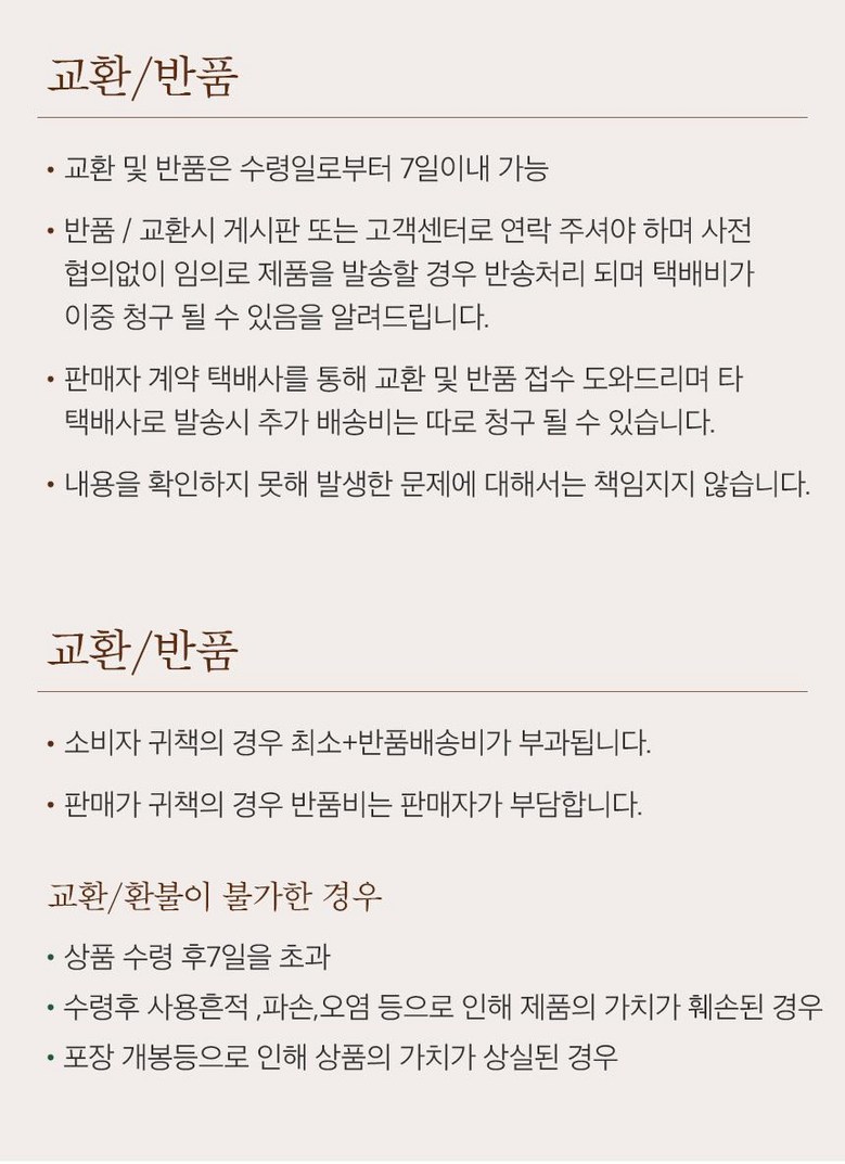 - ㆍ모니터 해상도의 차이로 인해 색상이나 이미지가 실제와 달라, 고객이 단순 변심으로 교환/반품을 무료로 요청하는 경우