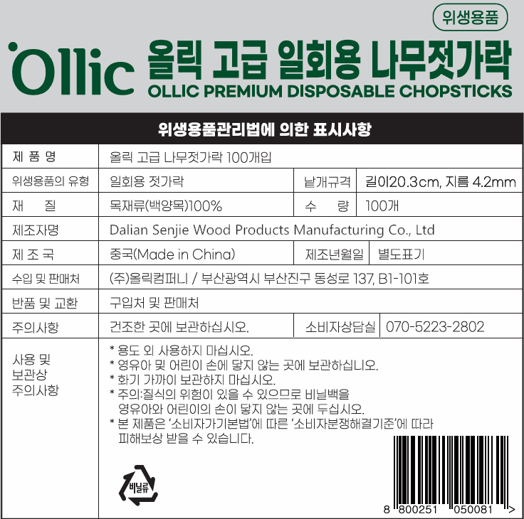 | 품명 및 모델명 | 올릭 고급 일회용 나무젓가락 | 인증/허가 사항 | 위생용품 |