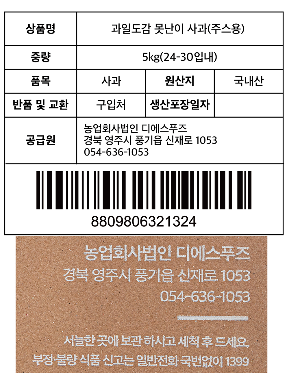 단단한 과육을 품은 못난이 사과예요. 겉이 조금 거칠거나, 색과 모양이 고르지 않을 수 있지만, 그 속에 진한 달콤함을 알차게 지니고 있답니다. 믹서에 넣고 갈아 주스를 만들어 드셔보세요. 특유의 상큼한 풍미 덕분에 기분까지 산뜻해질 거예요.