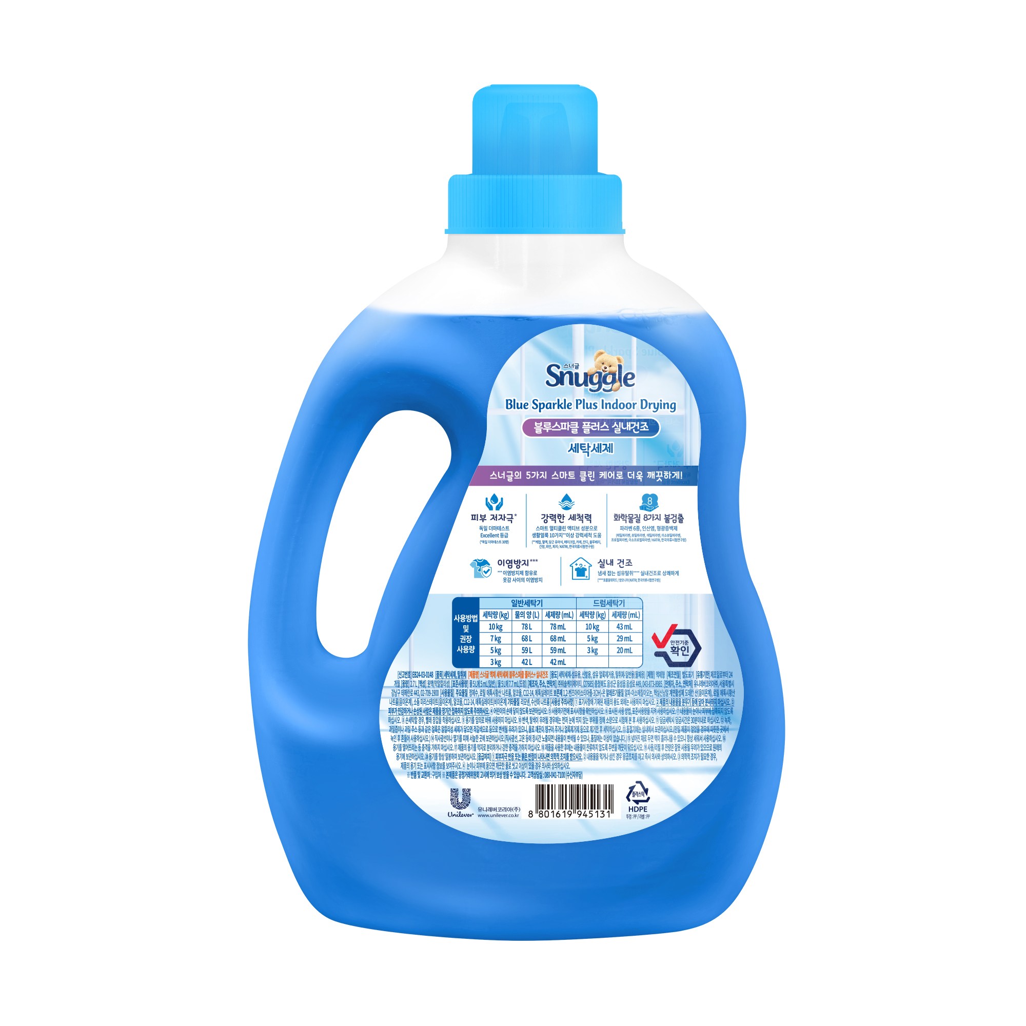 | 품목 및 제품명 | 세탁세제, 탈취제 / 스너글 액체 세탁세제 블루스파클 플러스+ 실내건조 | 용도(표백제의 경우 계열을 함께표시) 및 제형 | 세탁세제-섬유용, 신발용, 섬유 얼룩제거용, 탈취제-일반용(물체용) / 액체형 |