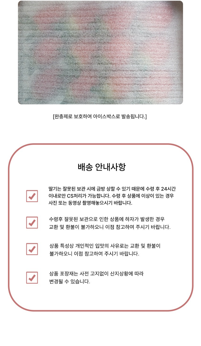 - ㆍ모니터 해상도의 차이로 인해 색상이나 이미지가 실제와 달라, 고객이 단순 변심으로 교환/반품을 무료로 요청하는 경우