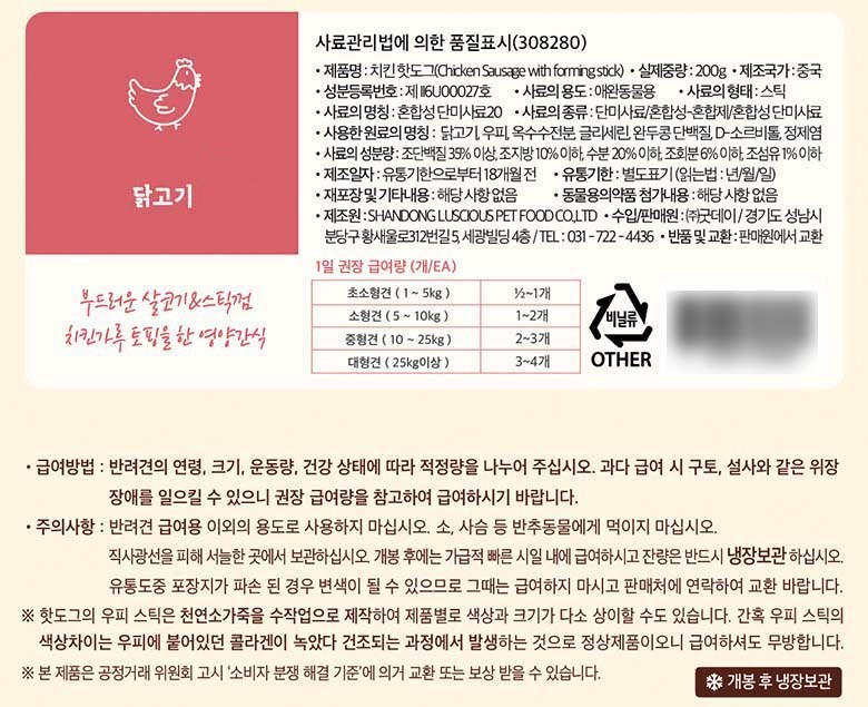 | 품명 및 모델명 | 수제 핫도그 닭고기 200g | 인증/허가 사항 | 사료관리법에 따른 성분등록번호 : 컨텐츠 참조 |