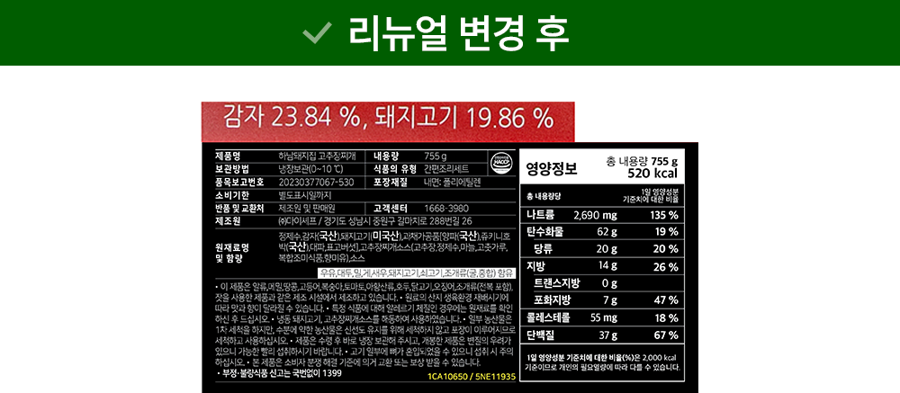 | 포장단위별 내용물의 용량(중량), 수량 | 컨텐츠 참조 | 원재료명 및 함량 | 컨텐츠 참조 |