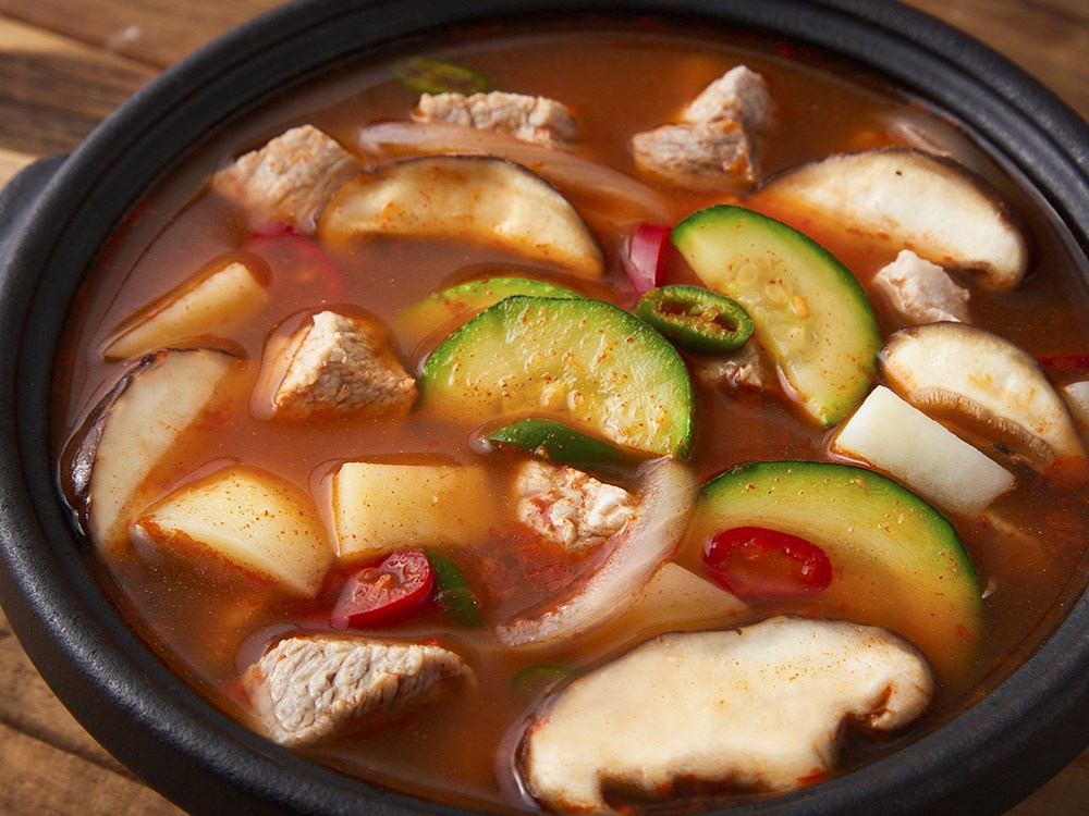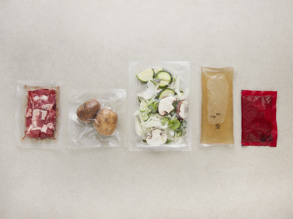 돼지고기, 감자, 대파, 양파, 쥬키니호박, 표고버섯, 육수, 소스로 구성되어 있습니다.