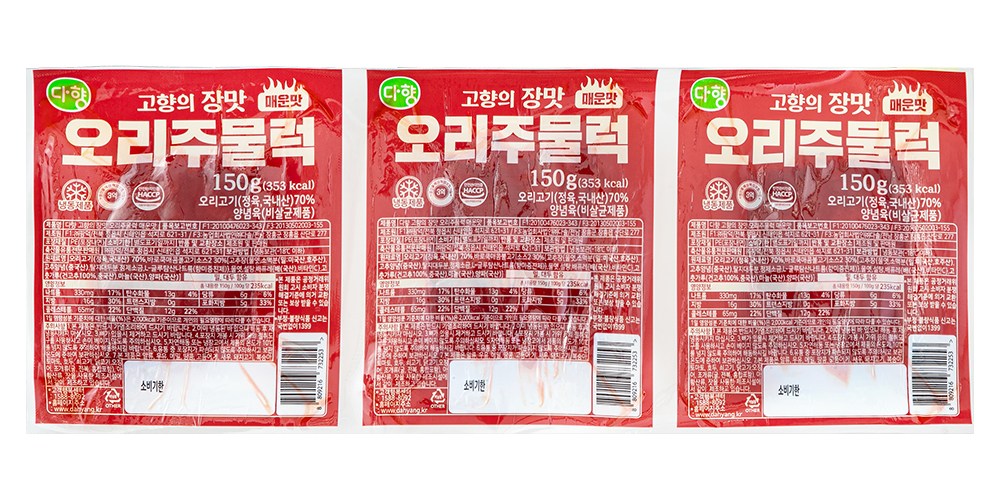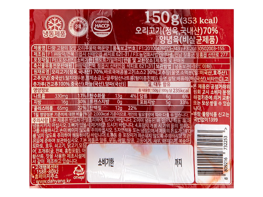 쫄깃쫄깃 맛있는 오리주물럭을 손쉽게 즐겨보세요. 요리하기 좋게 슬라이스 되어 있고, 따로 양념할 필요 없어 간편한데요. 은은한 단맛과 함께 느껴지는 기분 좋은 매콤함이 일품이랍니다. 그대로 볶아 드시기만 해도 맛있고, 채소나 당면을 더해 함께 드셔도 좋아요.
