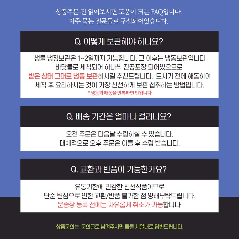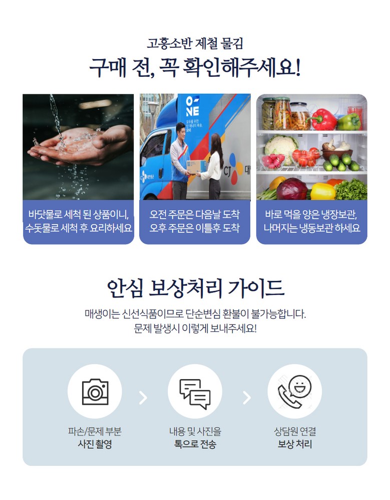 | 배송방법 | 신선/냉장/냉동 | 배송비 | 무료배송 - 도서산간 지역 배송불가 |
