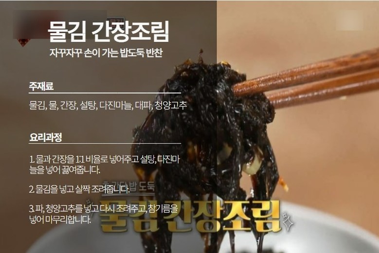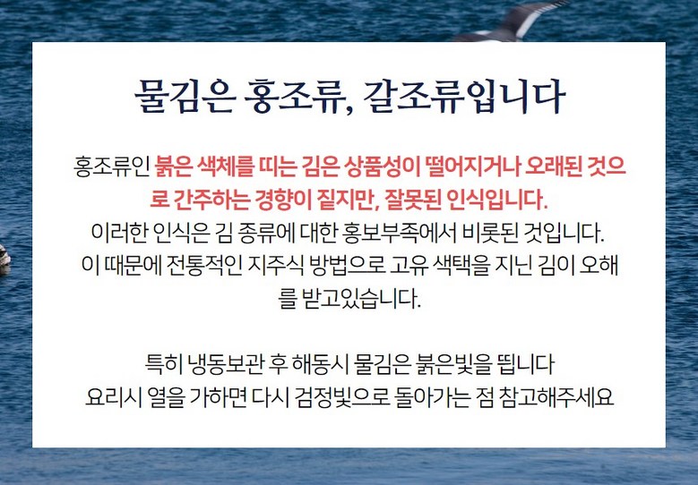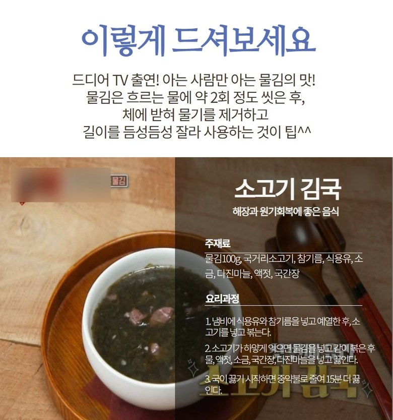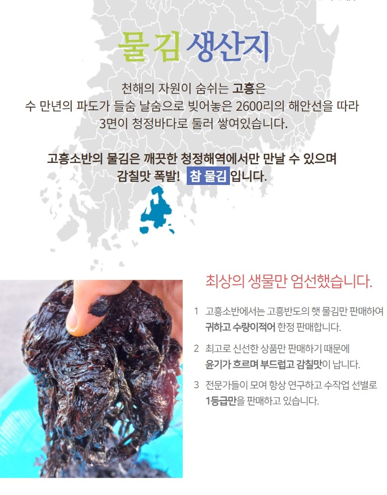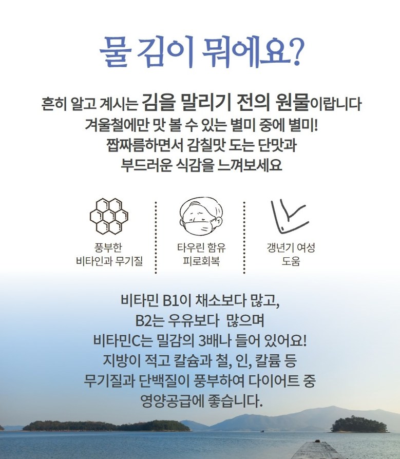 | 품목 또는 명칭 | 물김 | 포장단위별 내용물의 용량(중량),수량,크기 | 상품 상세페이지 참조 |