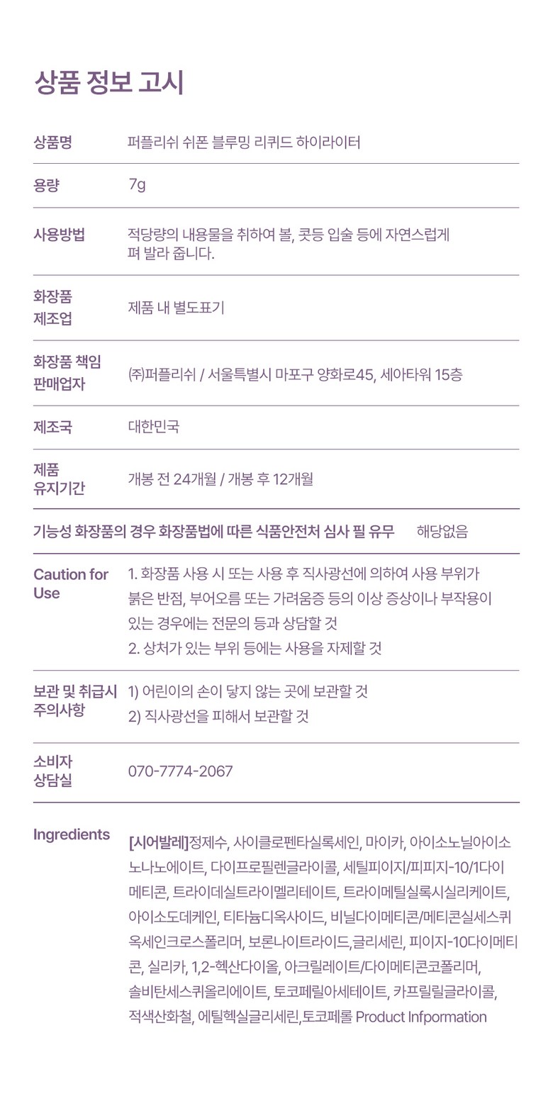 | 화장품제조업자, 화장품책임판매업자 및 맞춤형화장품판매업자 | 상품 상세페이지 참조 | 제조국 | 상품 상세페이지 참조 |
