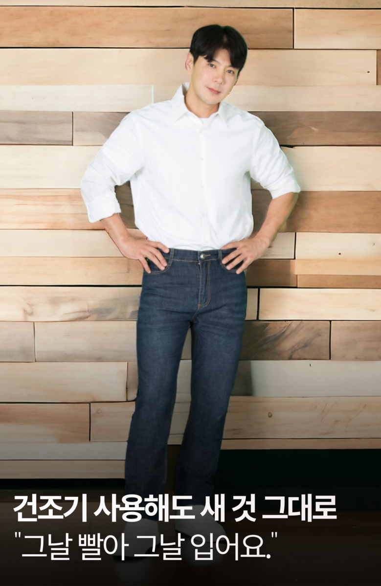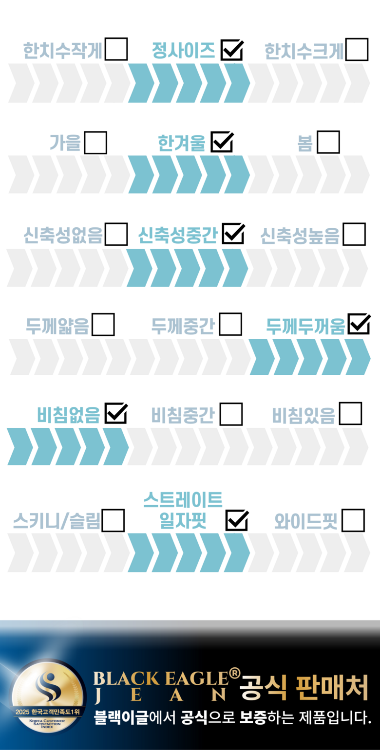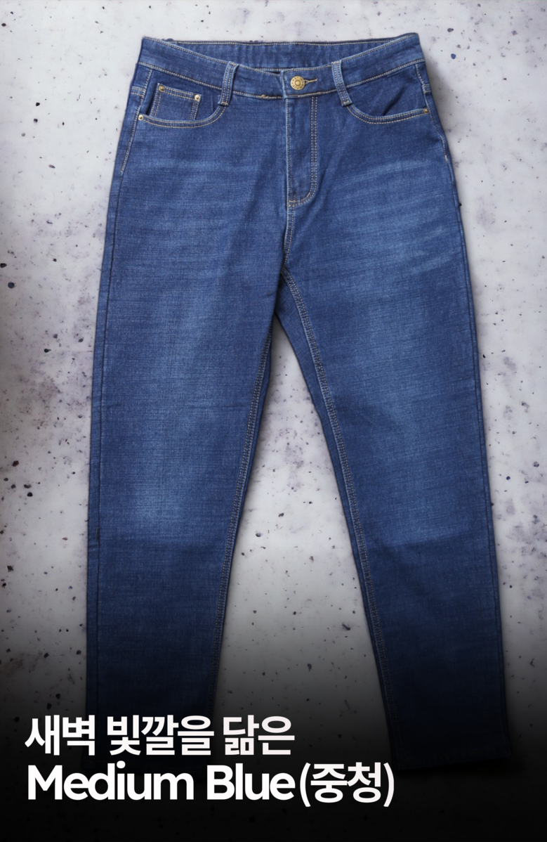 | 제품 소재 | Denim92%(=60%cotton+32%polyester) + Spandex8% | 색상 | Black Blue(흑청),Dark Blue(진청),Medium Blue(중청) |