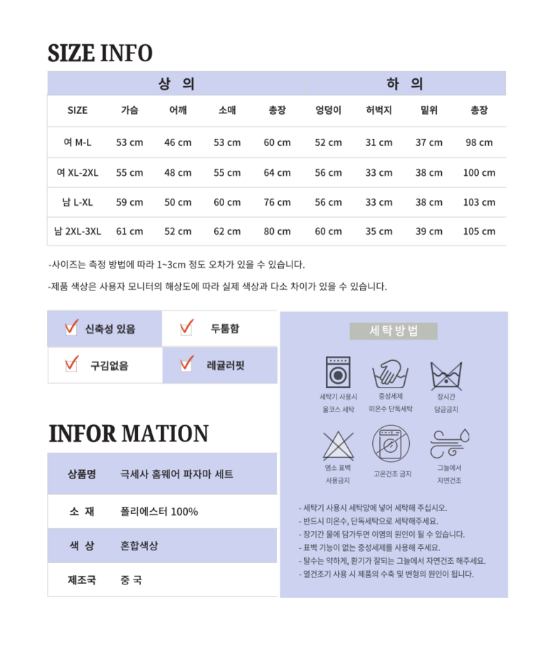 | 제조국 | 중국 | 세탁방법 및 취급시 주의사항 | 상품 상세페이지 참조 |