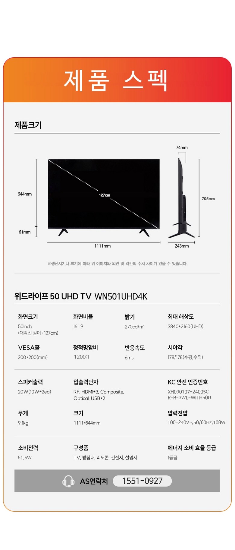 | 품명 및 모델명 | WN501UHD4K | KC 인증정보 | 상품 상세페이지 참조 |