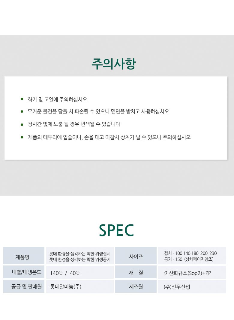 | 품명 및 모델명 | 롯데이라이프 환경을 생각하는 착한 위생접시 200mm | 재질 | 이산화규소(Sio2)+PP |