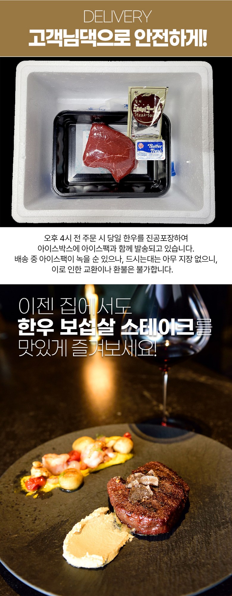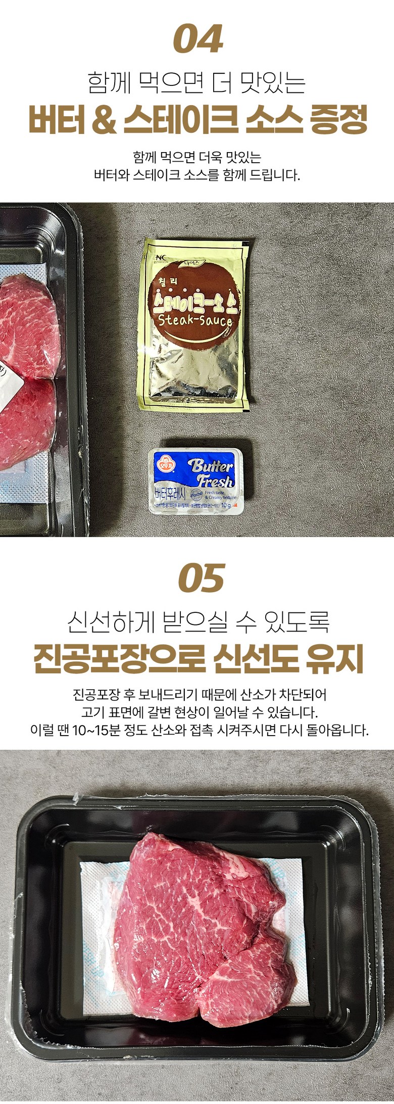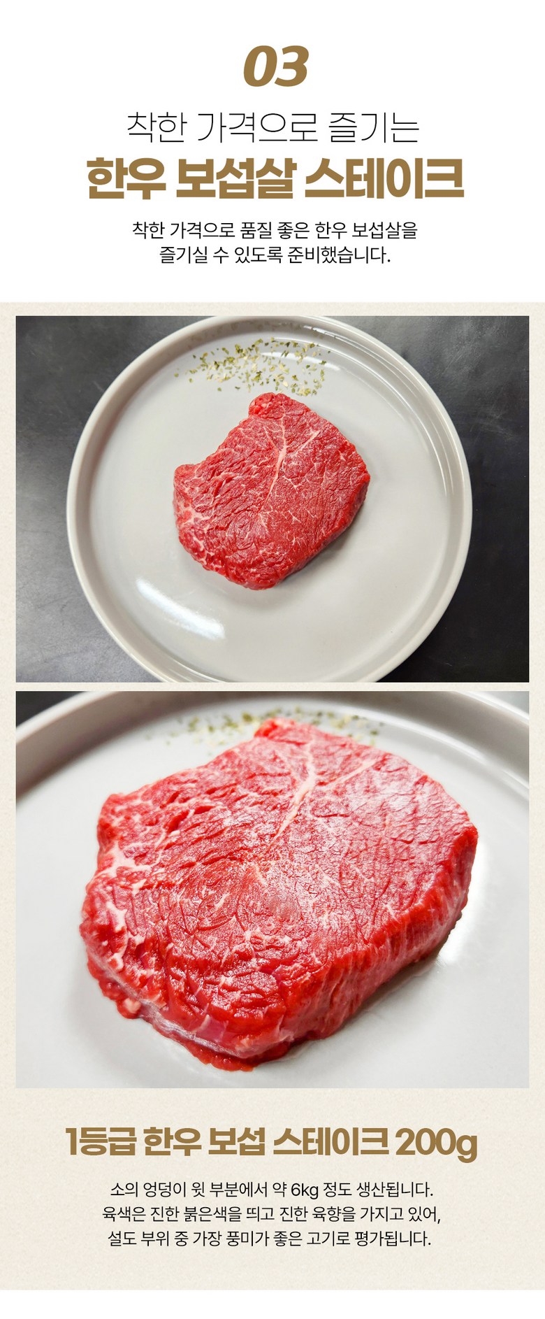| 품목 또는 명칭 | 무화 한우 1등급 보섭살 스테이크 200g+스테이크소스,버터 | 포장단위별 내용물의 용량(중량),수량,크기 | 200g |
