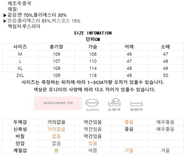 | 제조국 | 중국 | 세탁방법 및 취급시 주의사항 | 상품 상세페이지 참조 |