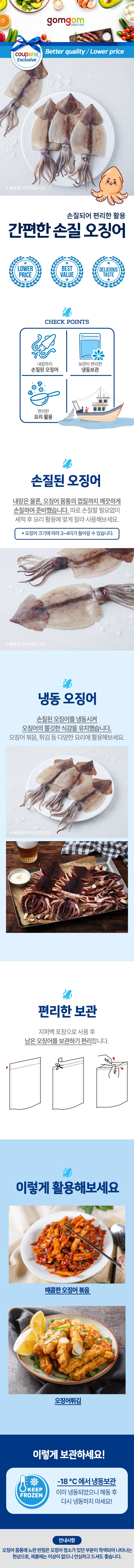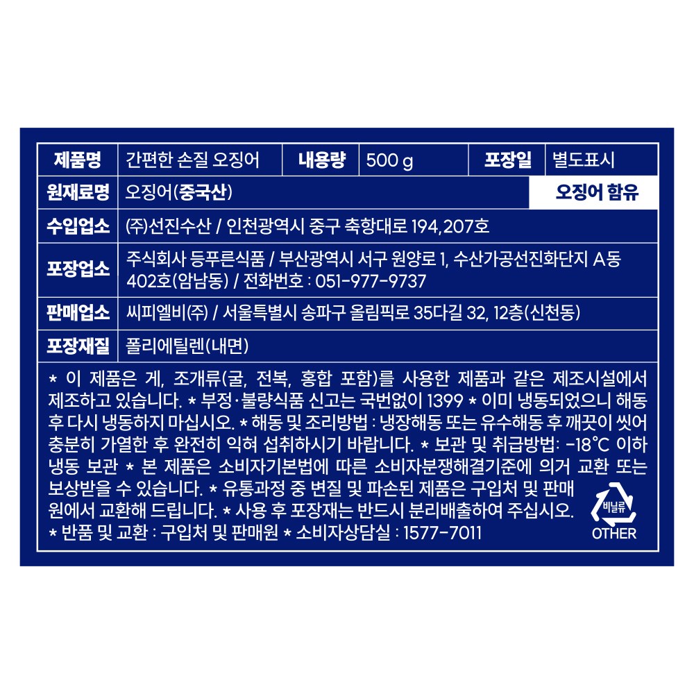| 품목 또는 명칭 | 간편한 손질 오징어 | 포장단위별 내용물의 용량(중량),수량,크기 | 500 g |