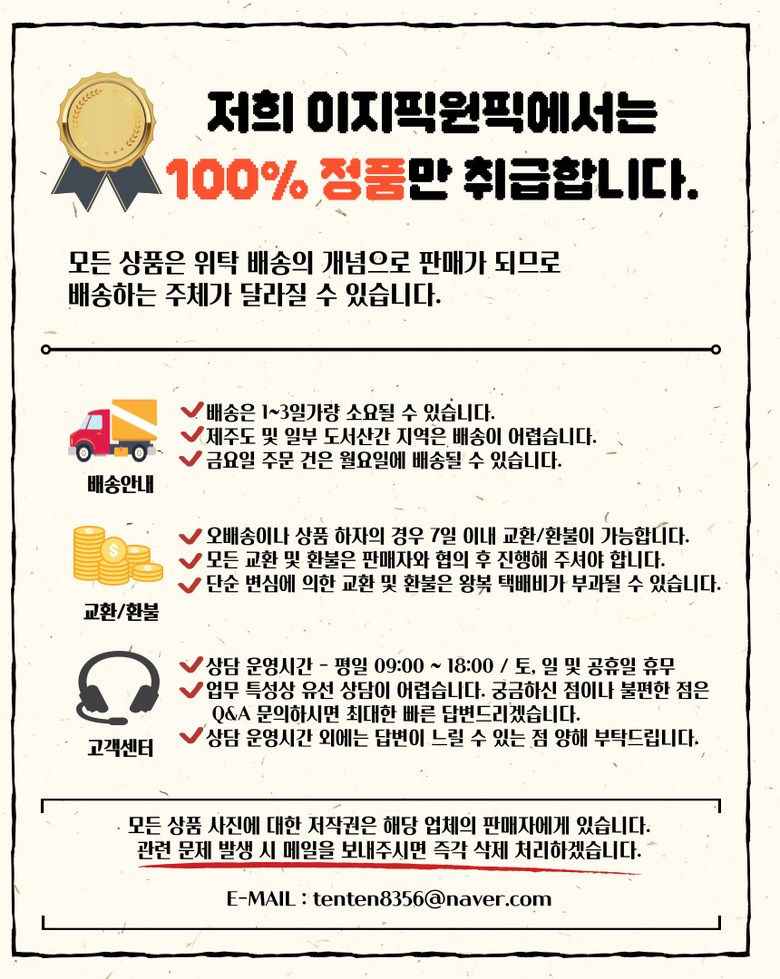 - ㆍ모니터 해상도의 차이로 인해 색상이나 이미지가 실제와 달라, 고객이 단순 변심으로 교환/반품을 무료로 요청하는 경우