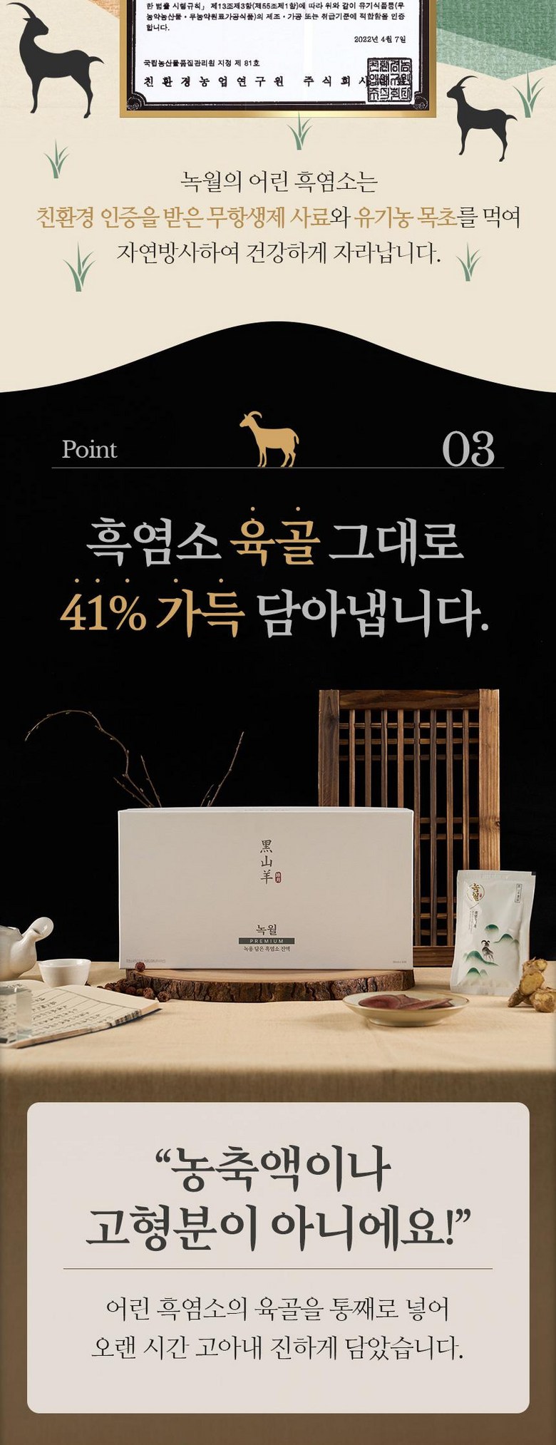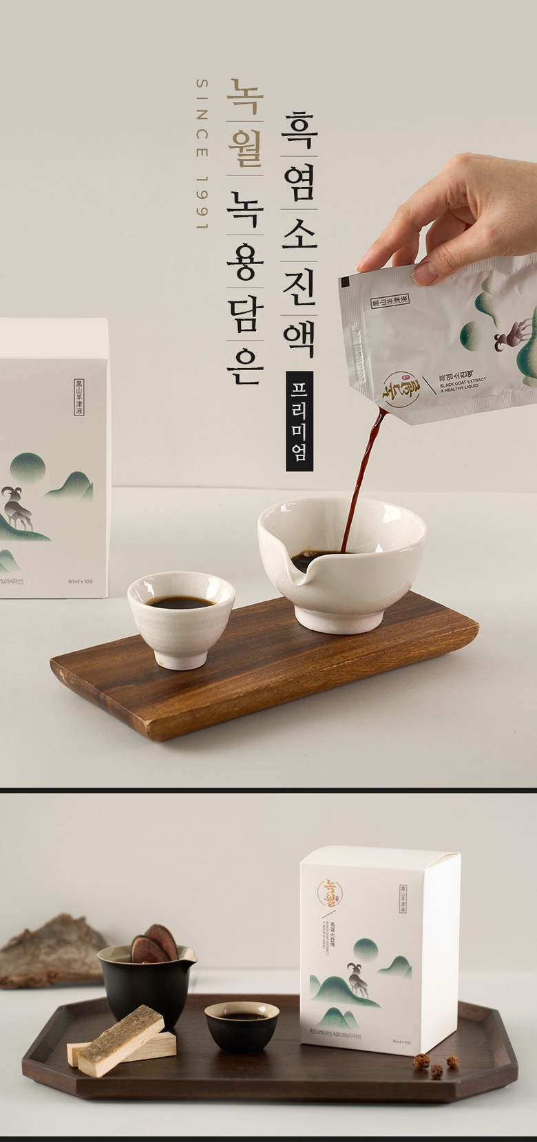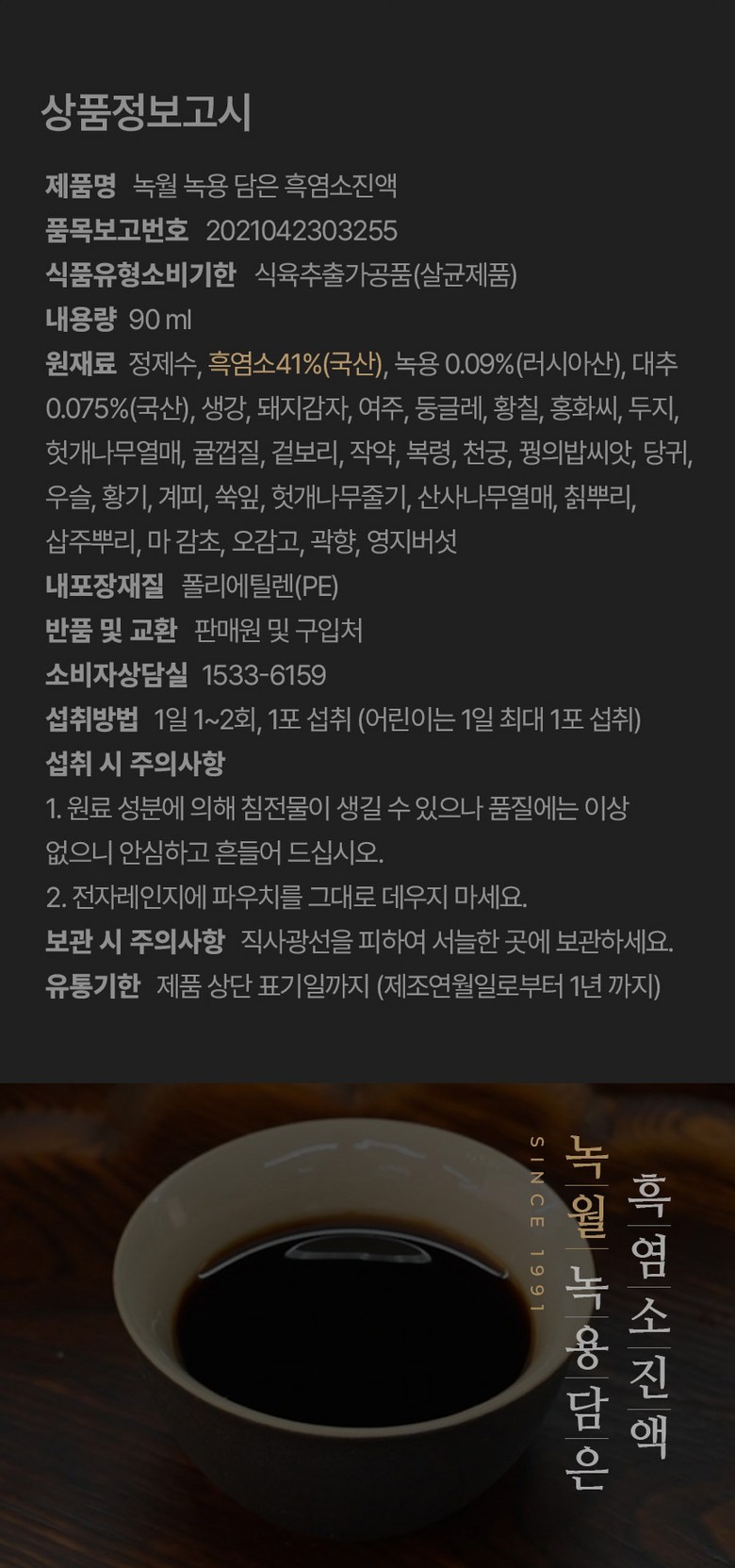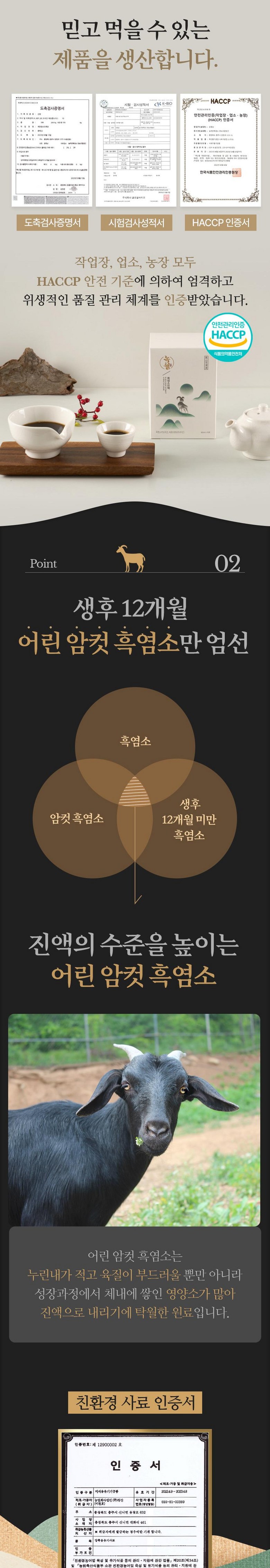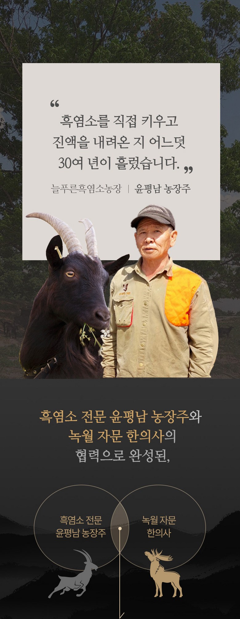 | 포장단위별 내용물의 용량(중량), 수량 | 90ml | 원재료명 및 함량 | 정제수,흑염소41%(국산),녹용0.09%(러시아산),대추0.075%(국산),생강,돼지감자,여주,둥글레,황칠,홍화씨,두지,헛개나무열매,귤껍질,겉보리,작약,복령,천궁,꿩의밥씨앗,당귀,우슬,황기,계피,쑥잎,헛개나무줄기,산사나무열매,칡뿌리,삽주뿌리,마,감초,오가목,곽향,영지버섯 |