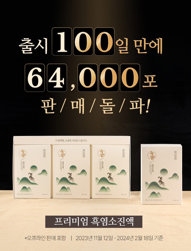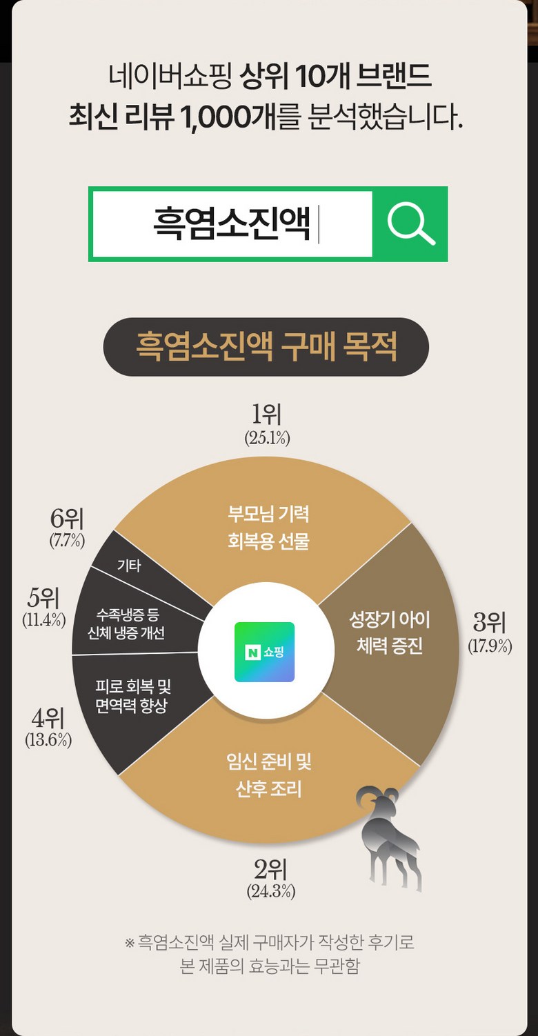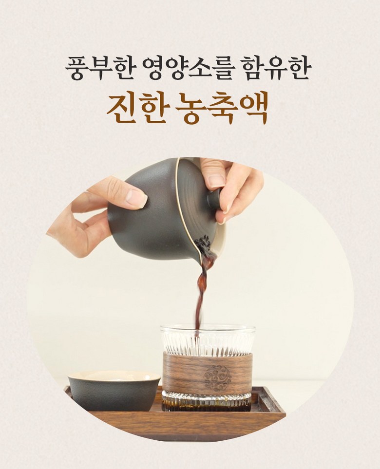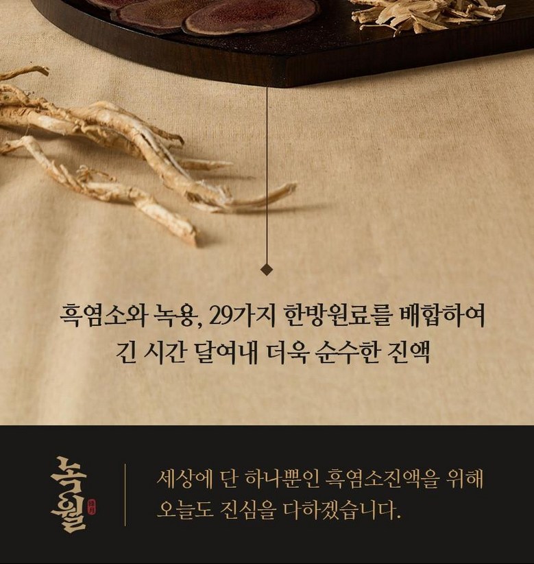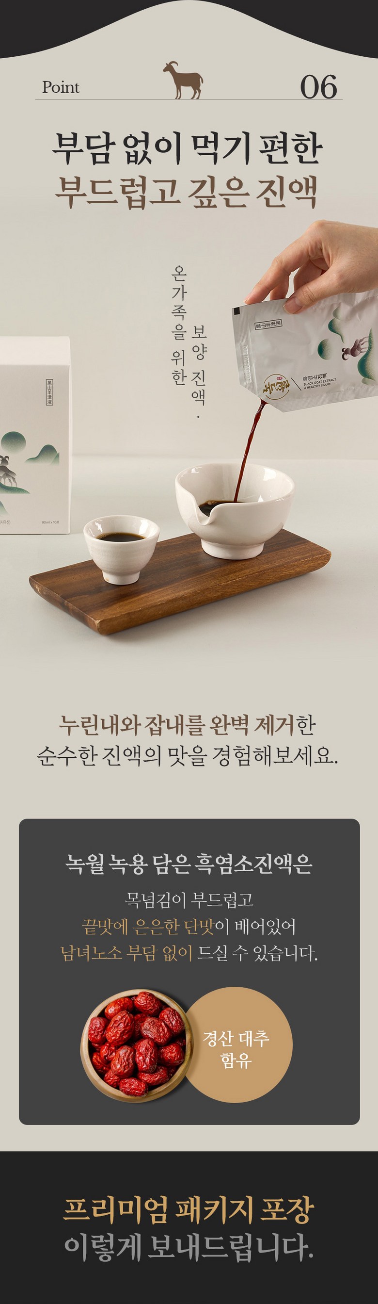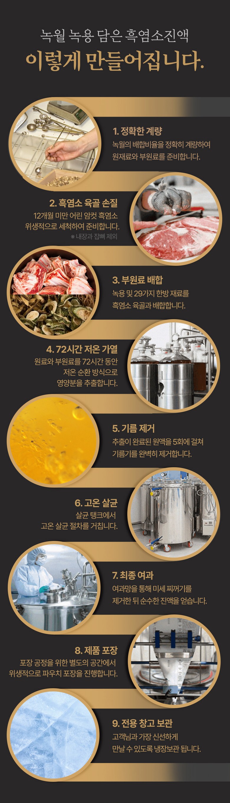 | 포장단위별 내용물의 용량(중량), 수량 | 90ml | 원재료명 및 함량 | 정제수,흑염소41%(국산),녹용0.09%(러시아산),대추0.075%(국산),생강,돼지감자,여주,둥글레,황칠,홍화씨,두지,헛개나무열매,귤껍질,겉보리,작약,복령,천궁,꿩의밥씨앗,당귀,우슬,황기,계피,쑥잎,헛개나무줄기,산사나무열매,칡뿌리,삽주뿌리,마,감초,오가목,곽향,영지버섯 |