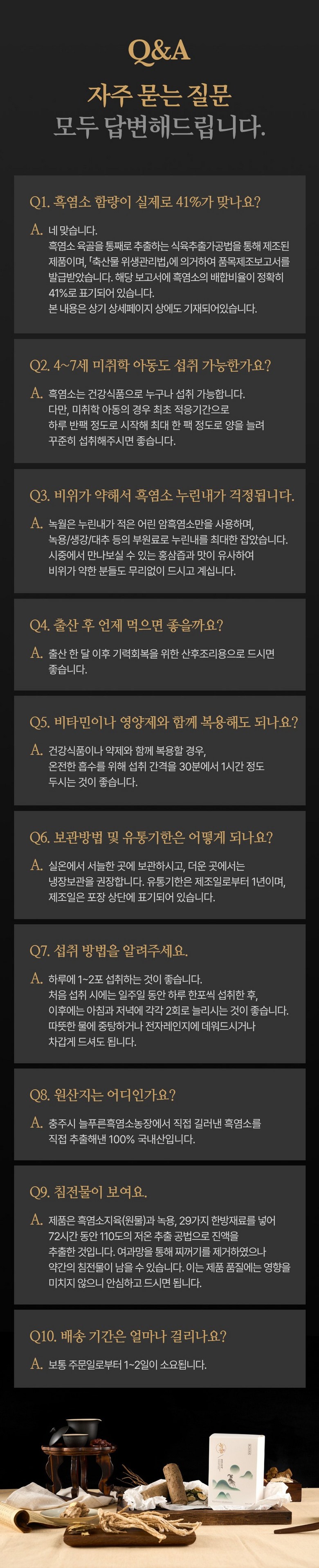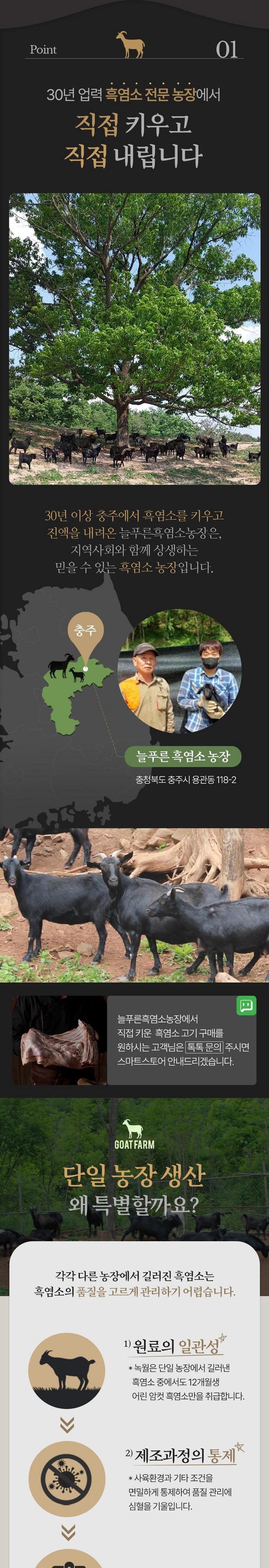 | 생산자 및 소재지 | 늘푸른흑염소농장(충청북도 충주시) | 제조연월일, 소비기한 또는 품질유지기한 | 소비기한 : 제조일로부터 1년 |