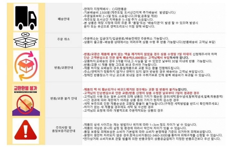 - ㆍ교환/반품에 관한 일반적인 사항은 판매자가 제시사항보다 관계법령이 우선합니다.