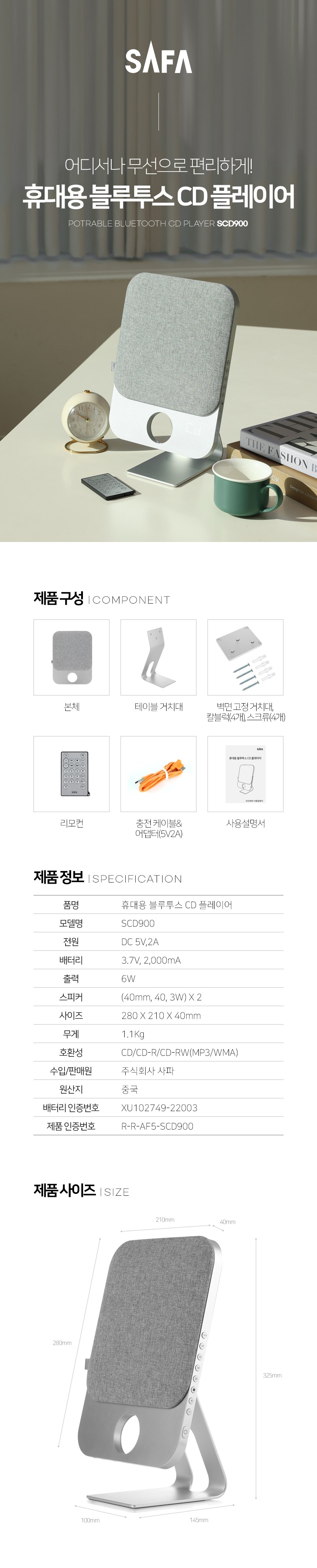 | 품명 및 모델명 | 사파 프리미엄 휴대용 블루투스 무선충전식 CD플레이어/ SCD900 | KC 인증정보 | 본품: R-R-AF5-SCD900, 전지: XU102749-22003B, 어댑터: R-R-HtE-HNT-M520RZ, HU101171-21001A |