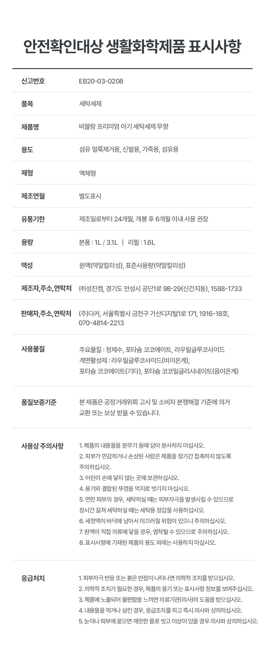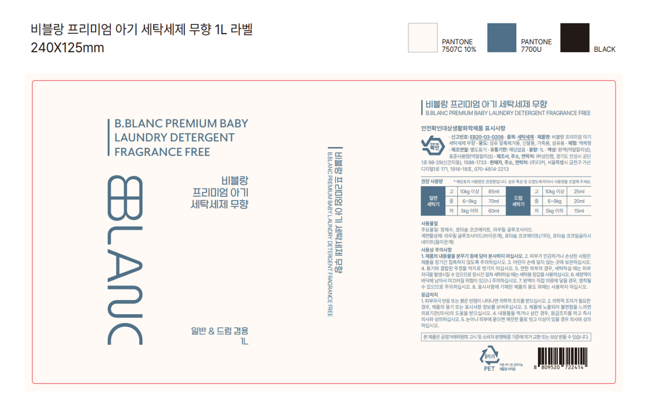 | 품목 및 제품명 | 세탁세제 / 비블랑 프리미엄 아기 세탁세제 무향 | 용도(표백제의 경우 계열을 함께표시) 및 제형 | 가죽용, 섬유 얼룩제거용, 섬유용, 신발용 / 액체형 |