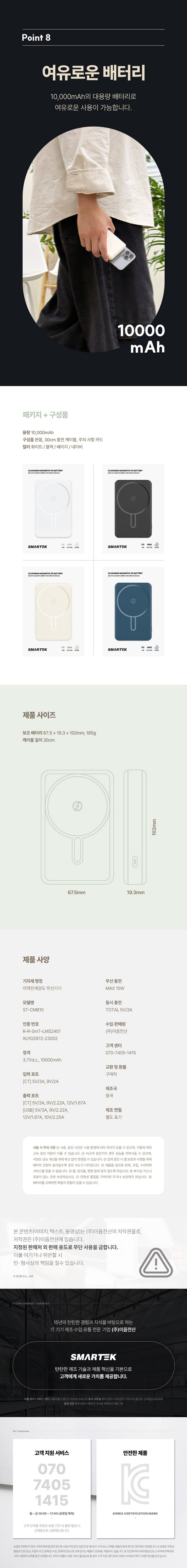 | 품명 및 모델명 | 유무선 마그네틱 보조 배터리 / ST-CMB10 | KC 인증정보 | 본품 : R-R-SmT-LMS2401 전지 : XU102972-23002A |