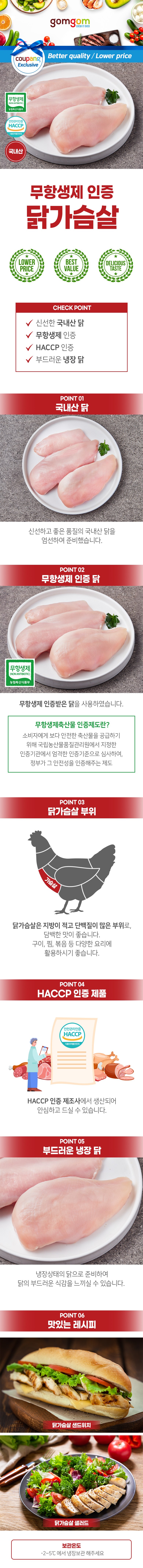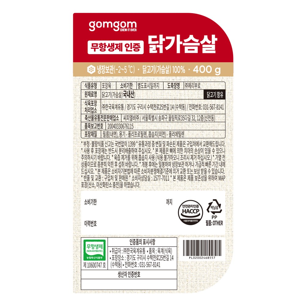 | 품목 또는 명칭 | 무항생제 인증 닭가슴살 | 포장단위별 내용물의 용량(중량),수량,크기 | 400g x 6개 |