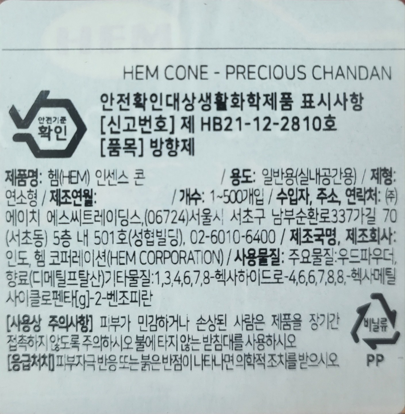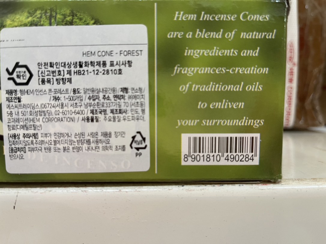 | 품목 및 제품명 | 방향제 / 헴(HEM) 인센스 콘 찬단 - 포레스트 | 용도(표백제의 경우 계열을 함께표시) 및 제형 | 일반용(실내공간용) / 연소형 |