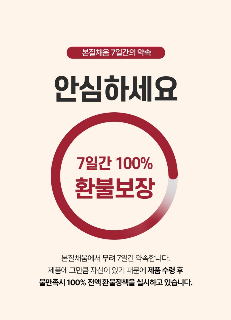 | 교환/반품 신청 기준일 | ㆍ단순변심에 의한 교환/반품은 제품 수령 후 7일 이내까지, 교환/반품 제한사항에 해당하지 않는 경우에만 가능 (배송비용과 교환/반품 비용 왕복배송비 고객부담) ㆍ상품의 내용이 표시·광고의 내용과 다른 경우에는 상품을 수령한 날부터 3개월 이내, 그 사실을 안 날 또는 알 수 있었던 날부터 |