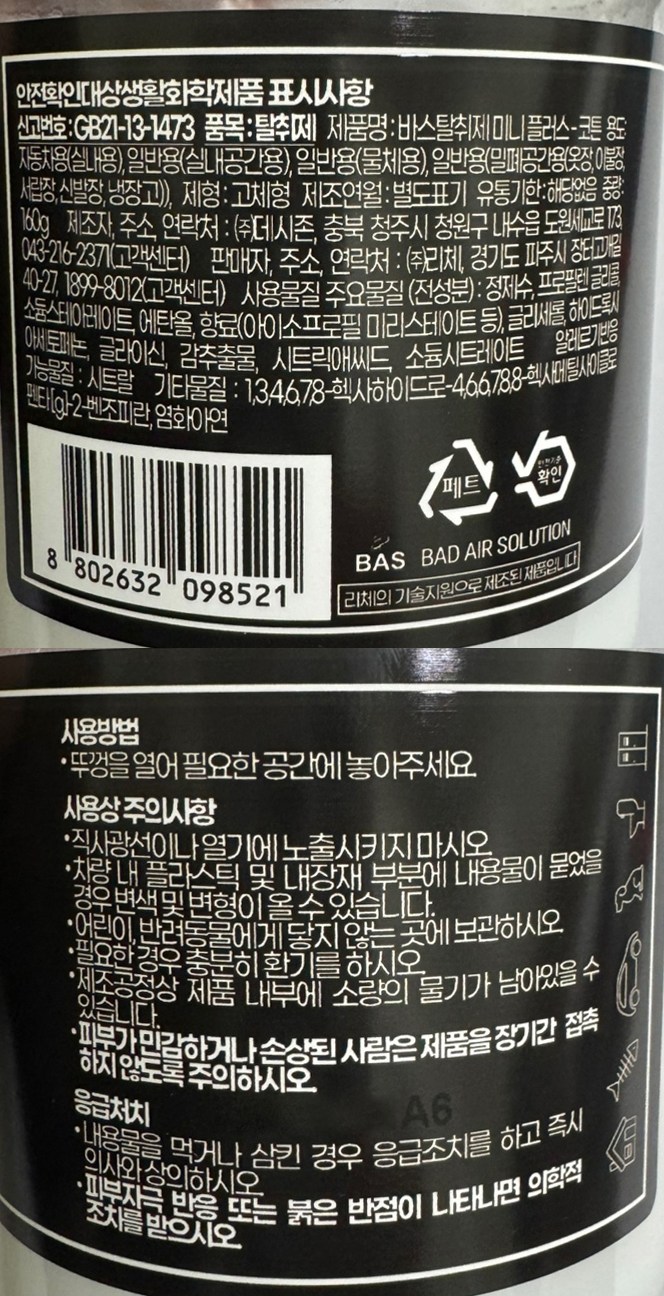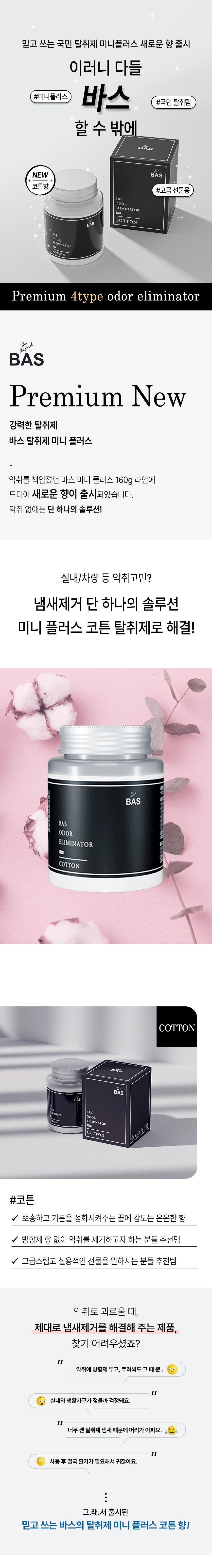 | 품목 및 제품명 | 탈취제 / 바스 탈취제 미니플러스-코튼 | 용도(표백제의 경우 계열을 함께표시) 및 제형 | 자동차용(실내용),일반용(실내공간용),일반용(물체용),일반용(밀폐공간용(옷장,이불장,서랍장,신발장,냉장고)) / 고체형 |