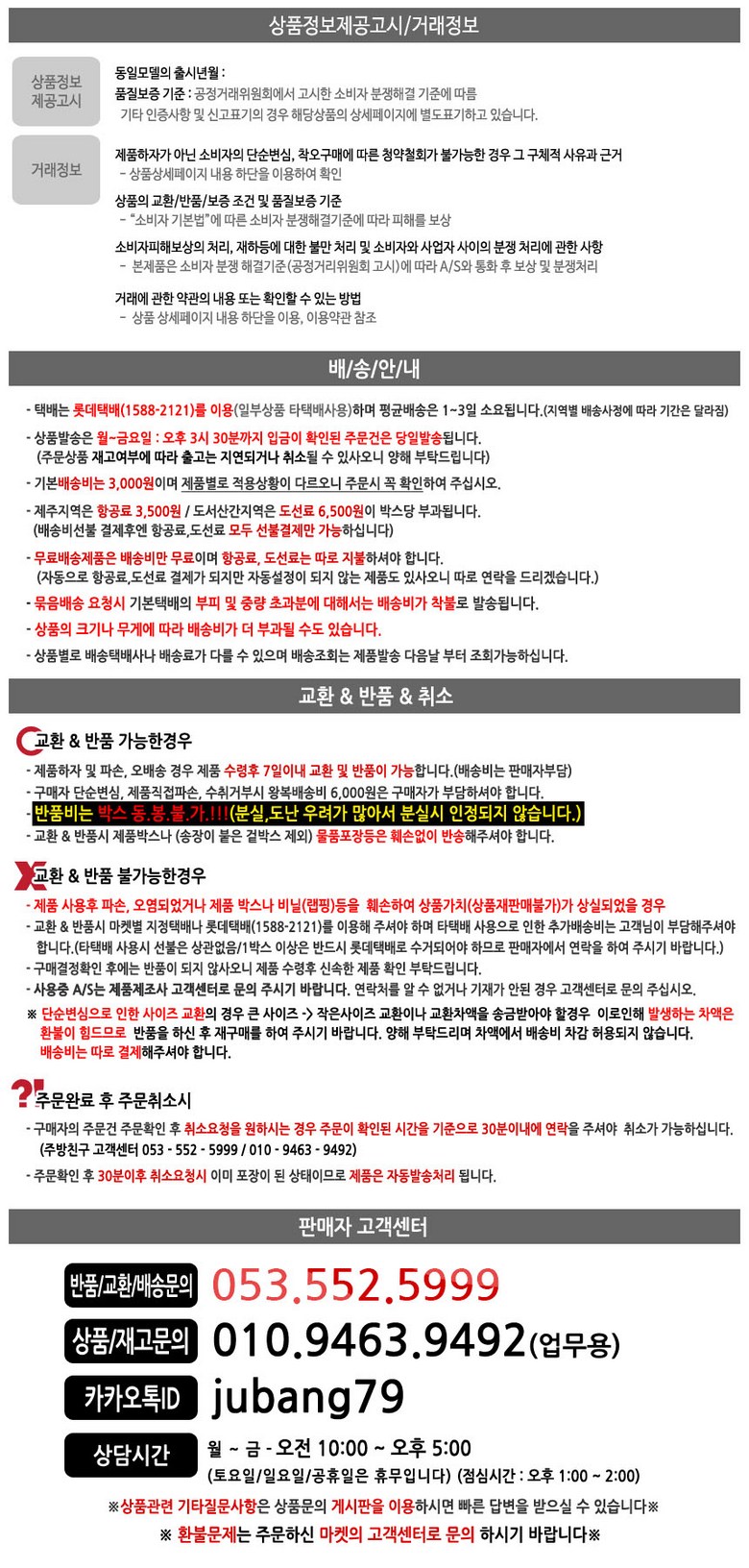 - ㆍ교환/반품에 관한 일반적인 사항은 판매자가 제시사항보다 관계법령이 우선합니다.