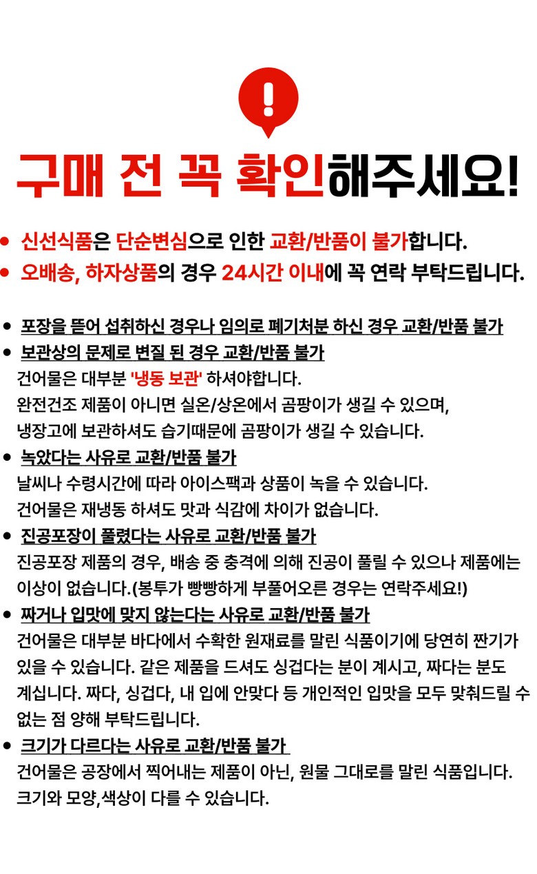 - ㆍ교환/반품에 관한 일반적인 사항은 판매자가 제시사항보다 관계법령이 우선합니다.