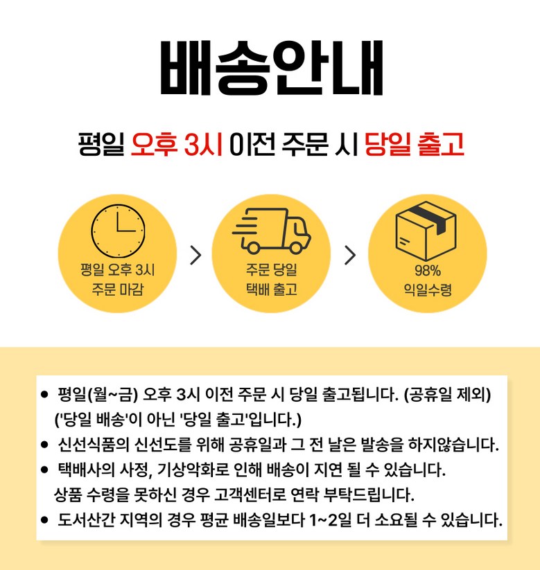 | 배송방법 | 신선/냉장/냉동 | 배송비 | 무료배송 - 도서산간 지역 배송불가 |