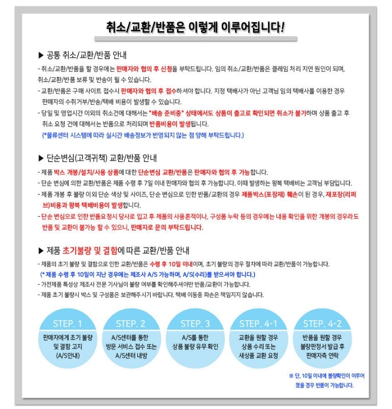 - ㆍ교환/반품에 관한 일반적인 사항은 판매자가 제시사항보다 관계법령이 우선합니다.